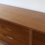 Mid Century Modern Bassett Low Dresser Credenza This is a mid century modern low dresser credenza by Bassett that has a beautiful angled accented design, nine dovetailed drawers with carved handles, and tapered legs with a subtle arched base. Dimensions: 66.5″W x 18″D x 30″H. *SOLD*