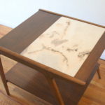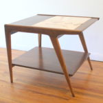 This is a mid century modern side end table from Drexel’s Profile series. It has a beautiful angled asymmetrical design, Italian travertine insert on top, magazine book shelf, and tapered legs. Dimensions: 26″W x 22″D x 21″H.