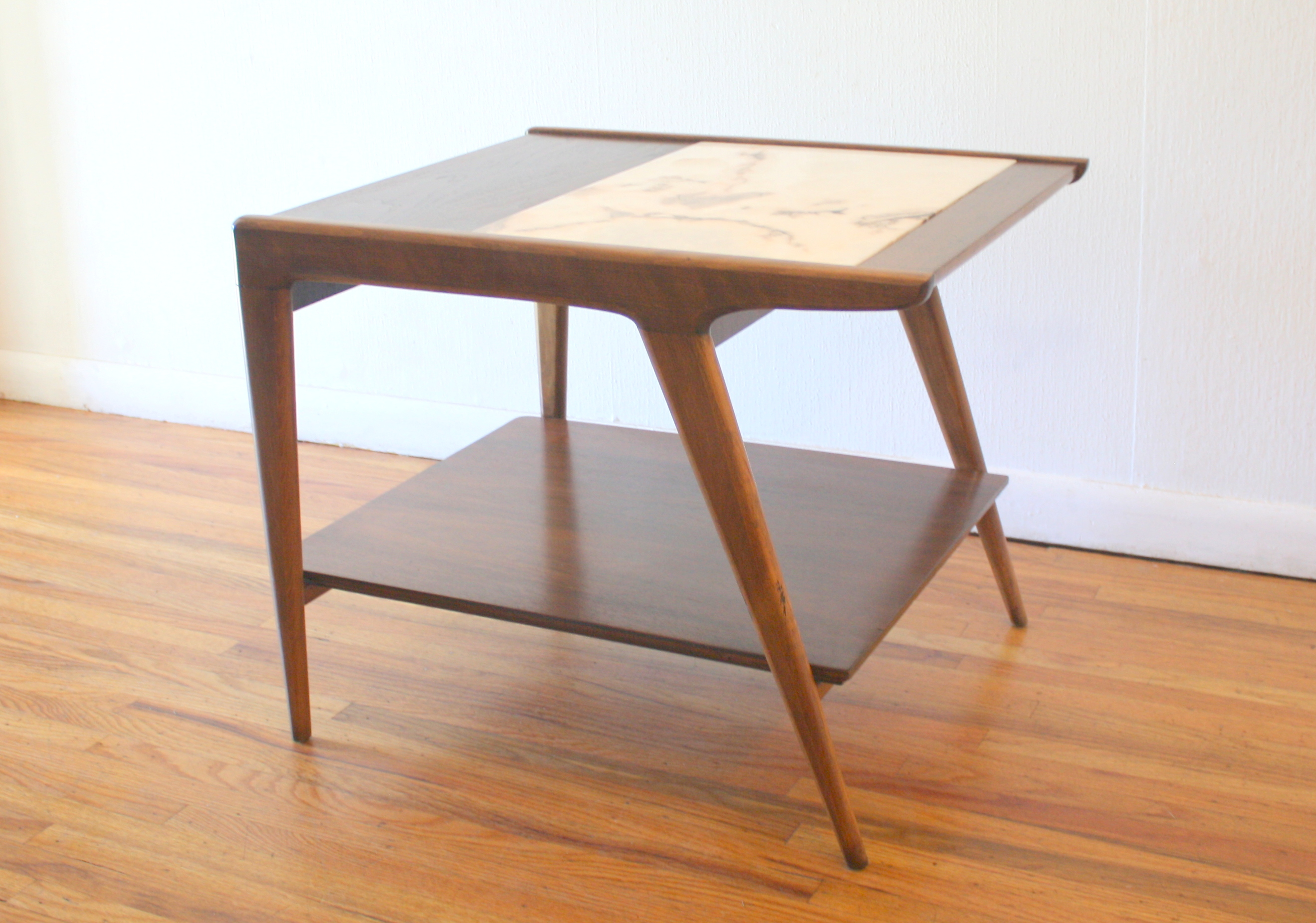 This is a mid century modern side end table from Drexel’s Profile series. It has a beautiful angled asymmetrical design, Italian travertine insert on top, magazine book shelf, and tapered legs. Dimensions: 26″W x 22″D x 21″H.