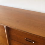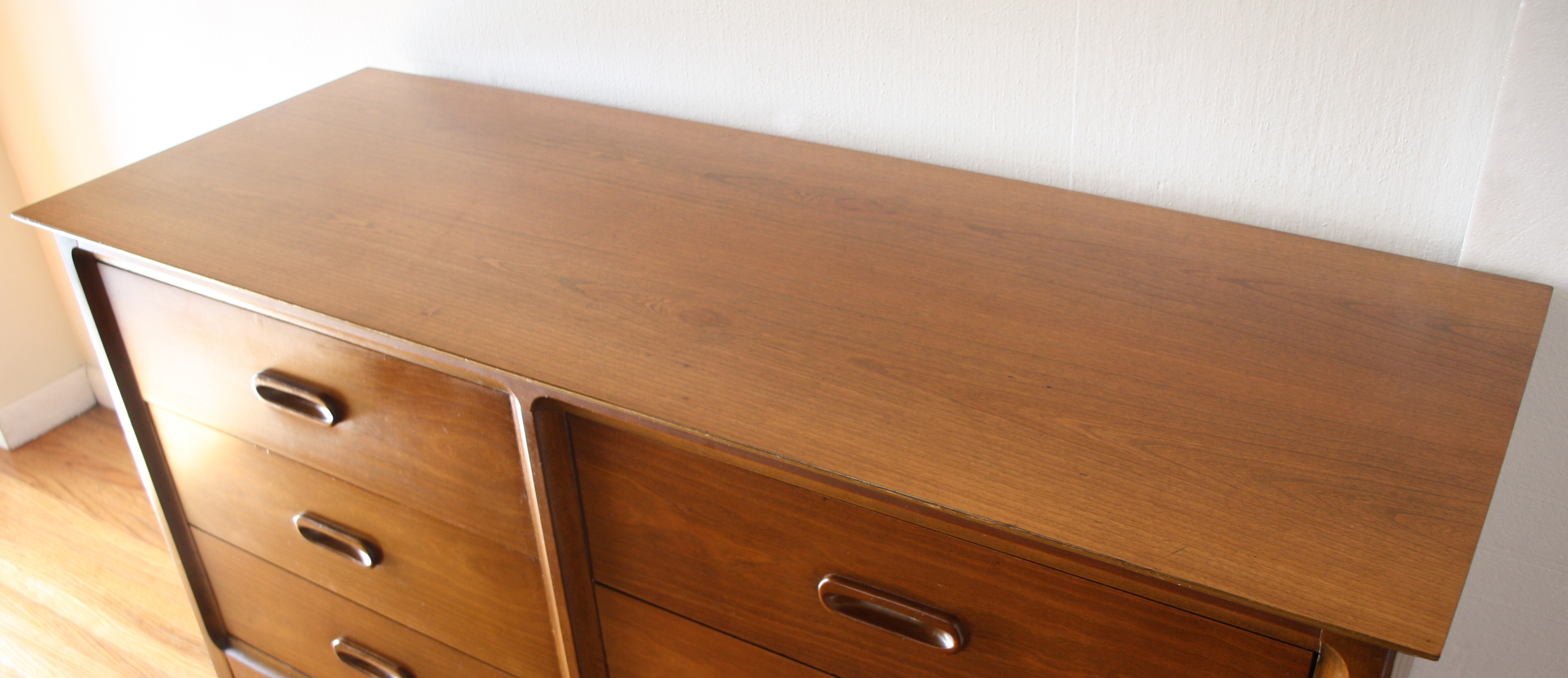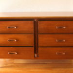 Mid Century Modern Low Dresser Credenza by Dixie This is a mid century modern low dresser credenza by Dixie. It has six dovetailed drawers with carved handles, and tapered legs. Dimensions: 54”W x 20”D x 31.5”H. *SOLD*