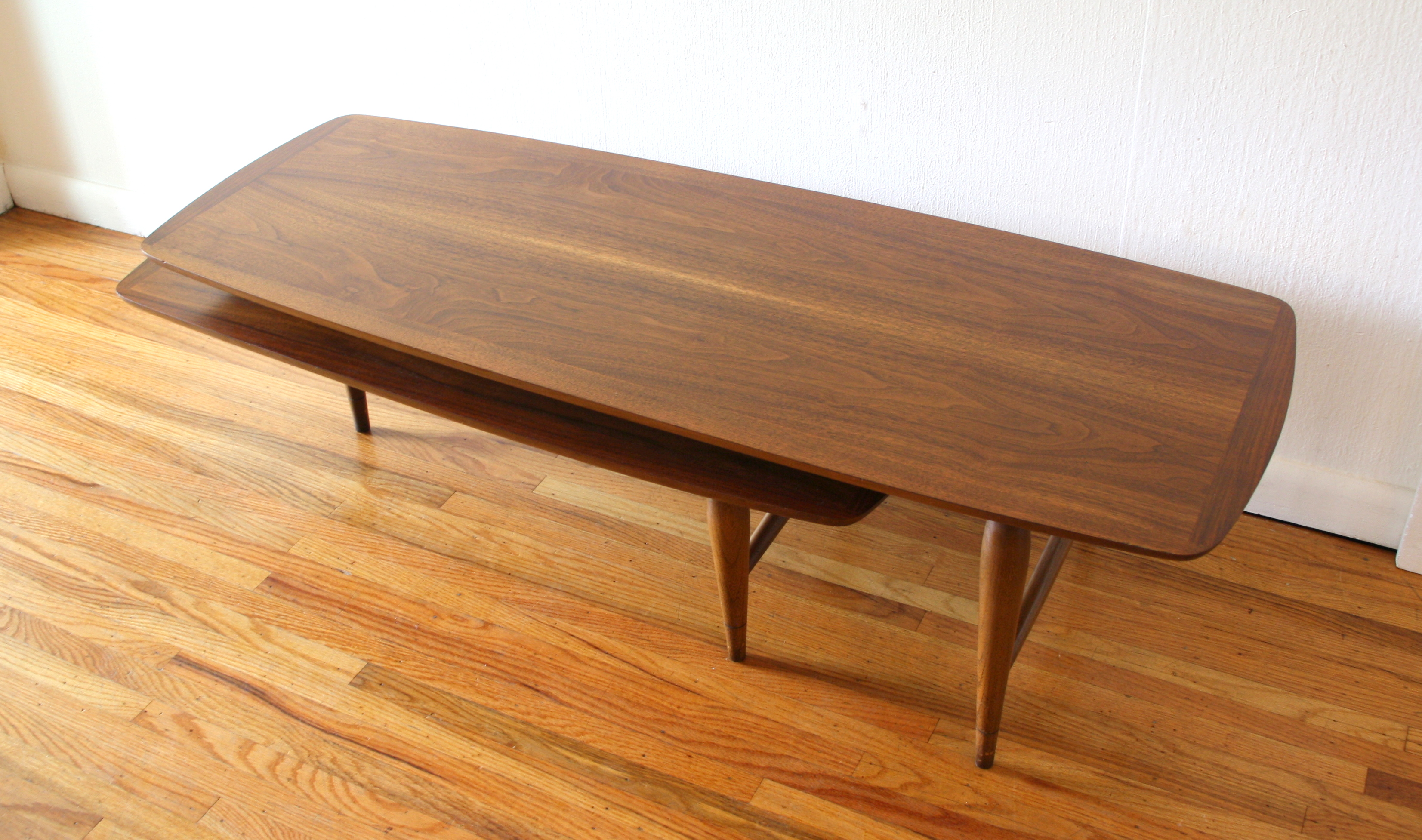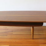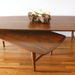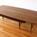 Mid Century Modern Boomerang Coffee Table This is a mid century modern boomerang surfboard coffee table with tapered legs. The bottom tier slides out to a boomerang design, or can be used underneath as a shelf. Dimensions: 52″W x 20″D x 14.5″H. *SOLD*