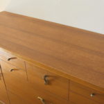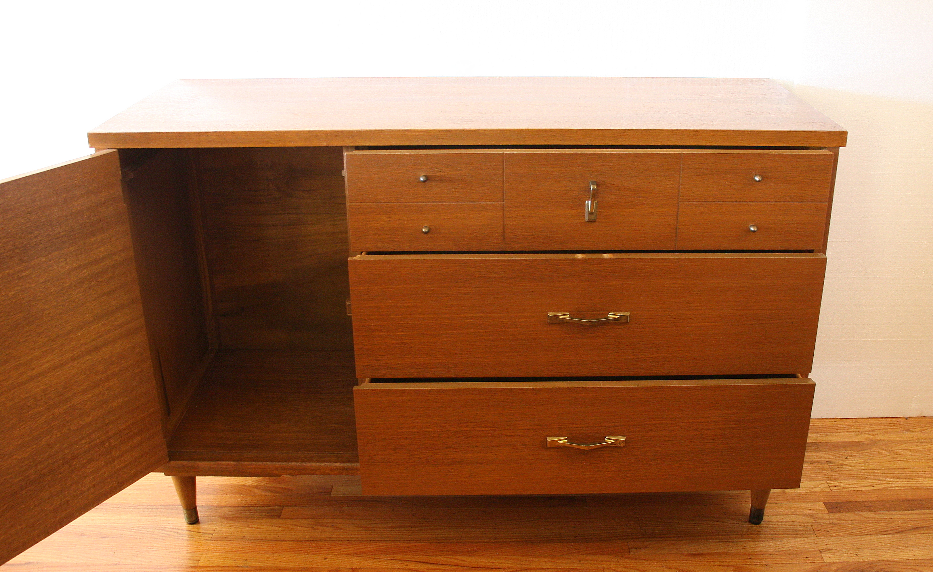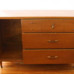 Mid Century Modern Mini Credenza This is a mid century modern mini credenza that has three dovetailed drawers with angled brass pulls and knobs, brass accented tapered legs, and a side cabinet. Dimensions: 50″W x 19″D x 32″H. 1 Mcm mini credenza is available: $650