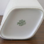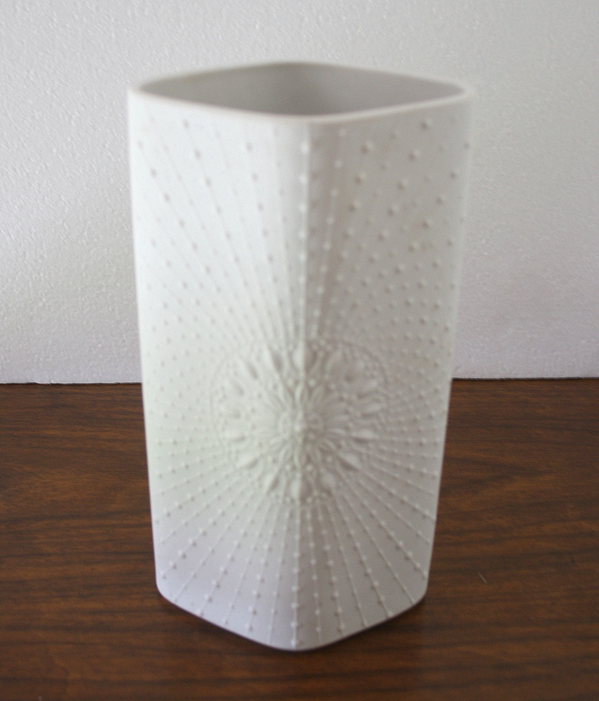 This is a mid century modern sunburst vase by Krautheim from Bavaria, Germany.  It has the sunburst pattern on both sides, and a diamond shape.  Dimensions: 4.5″W x 3″D x 8″H.