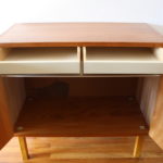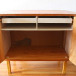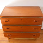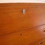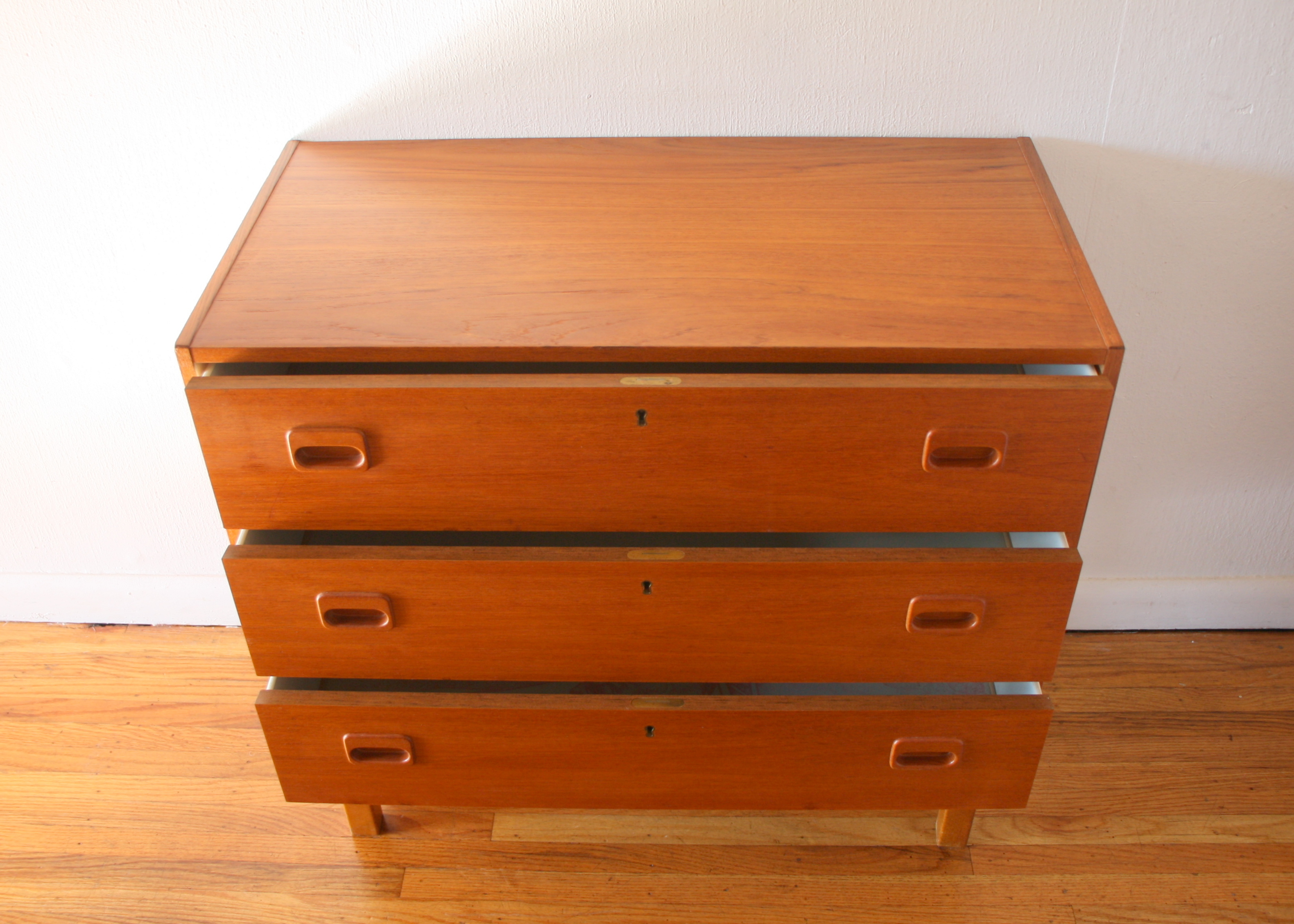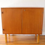 This is a mid century modern Danish teak bachelor chest dresser and teak cabinet. The bachelor chest has 3 lockable drawers with carved handles. The teak cabinet is also lockable and has two doors that open to a cabinet with 2 small mini drawers and shelves inside. The dimensions are: 29.5″W x 14.75″D x 27.5″H, for each piece.