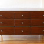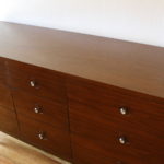This is a mid century modern low dresser credenza that has nine dovetailed drawers with a beautiful wood grain, metal knobs with a pop of mod white, and tapered legs.  Dimensions: 62.5″W x 17.5″D x 30.5″H.