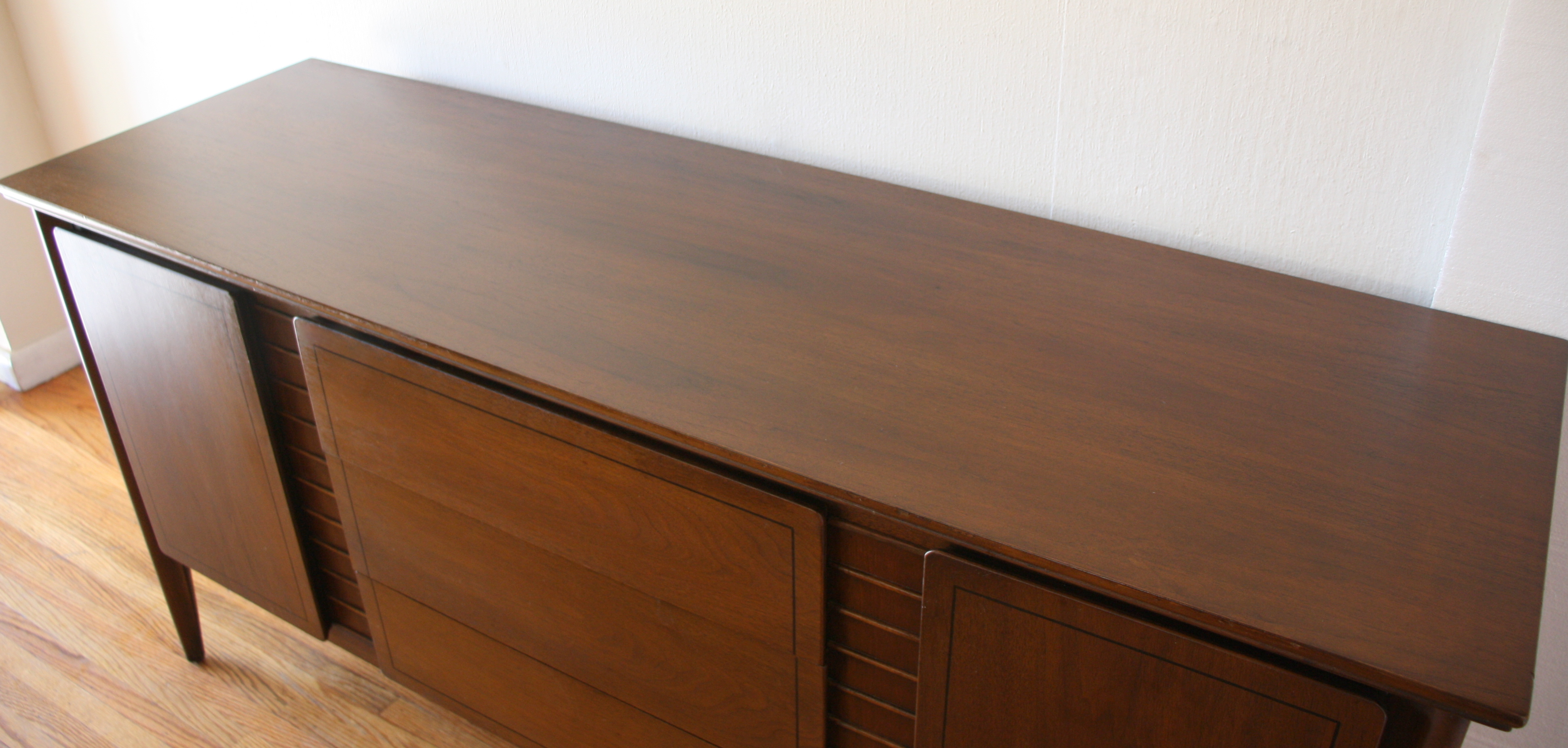Mid Century Modern Credenza This is a mid century modern credenza with 2 side cabinets, 3 dovetailed drawers, and tapered legs. Dimensions: 62″W x 19″D x 30″H. *SOLD*