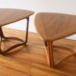 Mid Century Modern Pair of Guitar Pick Triangle Side End Tables by Lane This is a mid century modern pair of side end tables by Lane. They have solid wood sculpted frames, with a guitar pic triangle design. Dimensions: 27″W x 26″D x 18″H. *SOLD*
