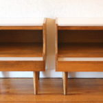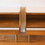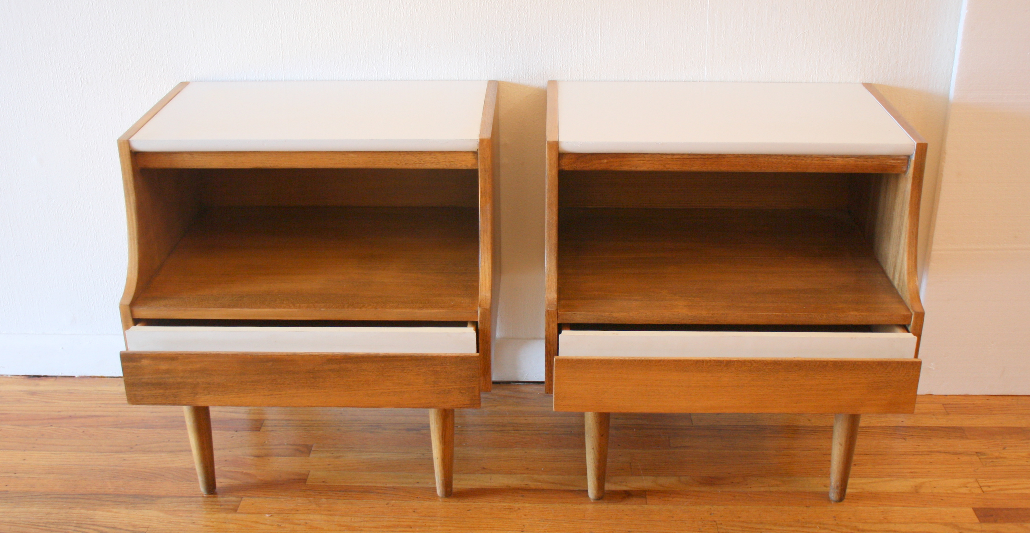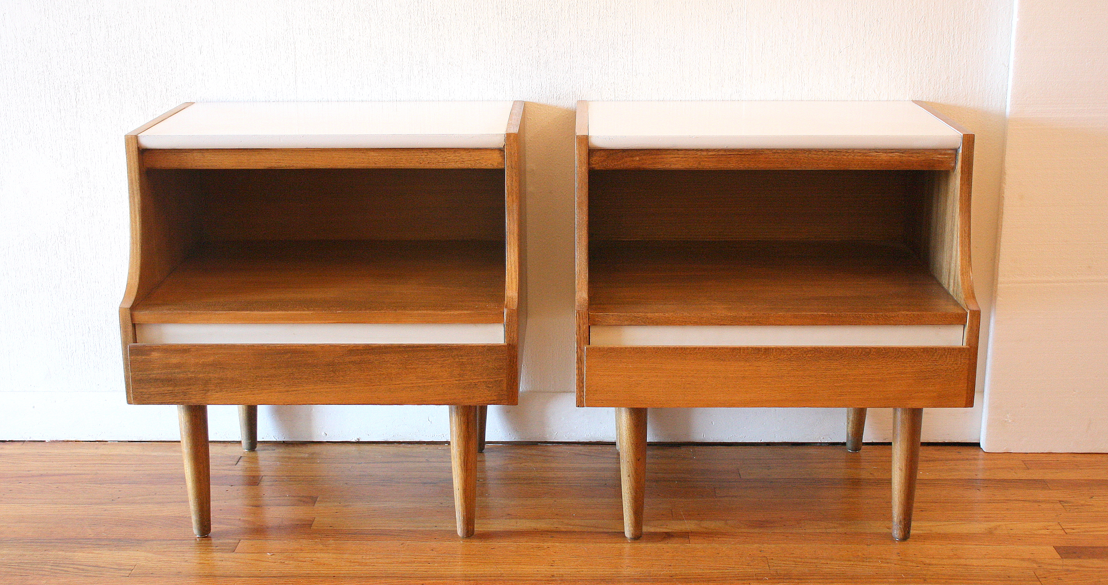 This is a pair of mid century modern side end table nightstands with mod white tops and accented dovetailed drawers. It has a top shelf, bottom drawer, and tapered legs. Dimensions: 21″W x 16″D x 22.5″H.