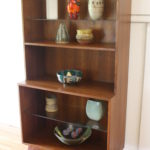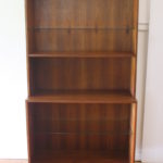 Mid Century Modern Shelving Unit Hutch This is a two tiered mid century modern shelving unit hutch with adjustable/removable glass shelves, and splayed legs. Dimensions: 35″W x 16″D x 65″H. 1 Mcm shelving unit with glass shelves is available: $550