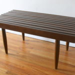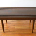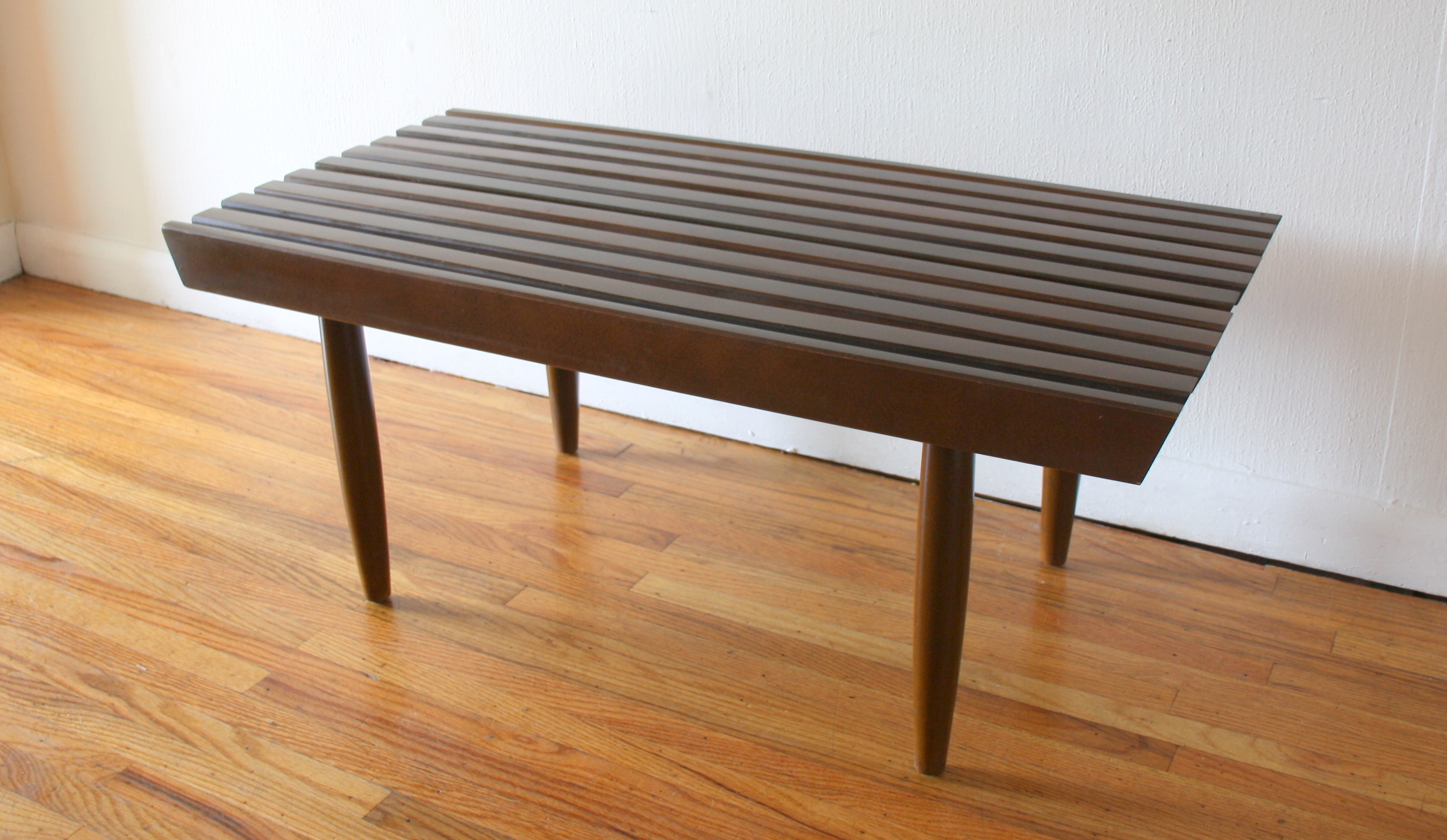 Mid Century Modern Slatted Coffee Table Bench This is a mid century modern slatted coffee table bench with an angled design and tapered legs. Dimensions: 36″W x 18″D x 15″H. 1 Mcm slatted coffee table bench is available: $295