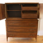 This is a mid century modern tall dresser armoire by Kent Coffey. It has their signature arched design on its doors, shelving and 2 smaller drawers inside, 3 dovetailed drawers with brass accented pulls, and sculpted tapered legs. Dimensions: 42″W x 20″D x 52″H.