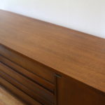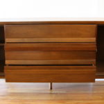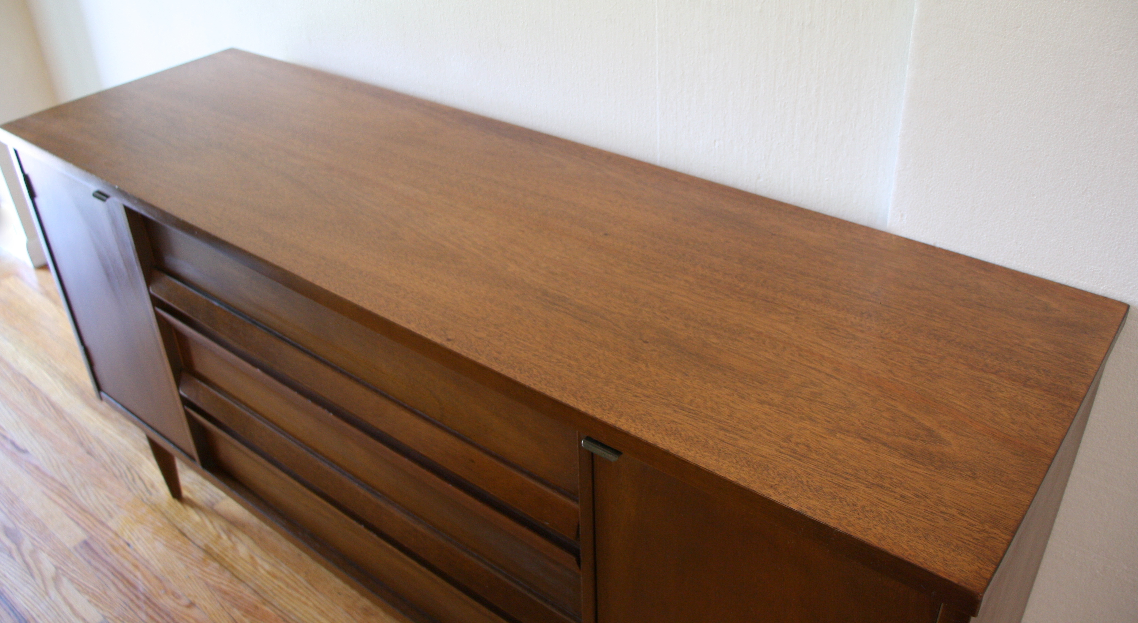This is a mid century modern credenza by Bassett. It has 3 dovetailed drawers with angled pulls, 2 side cabinets with shelving, and tapered legs. Dimensions: 60″ W x 18″ D x 30″ H.