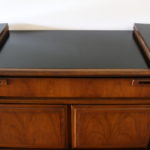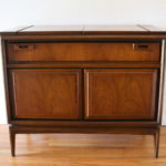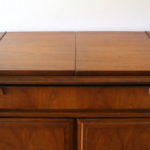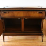 This is a mid century modern credenza with a hidden flip top bar serving top, 1 dovetailed utility drawer, bottom storage cabinet, and sculpted tapered legs. It has wheels for easy serving, which are also removable for stationary use. Dimensions: 38.5″W (leaves closed), 60.5″W (both leaves open) x 19″D x 32″H.