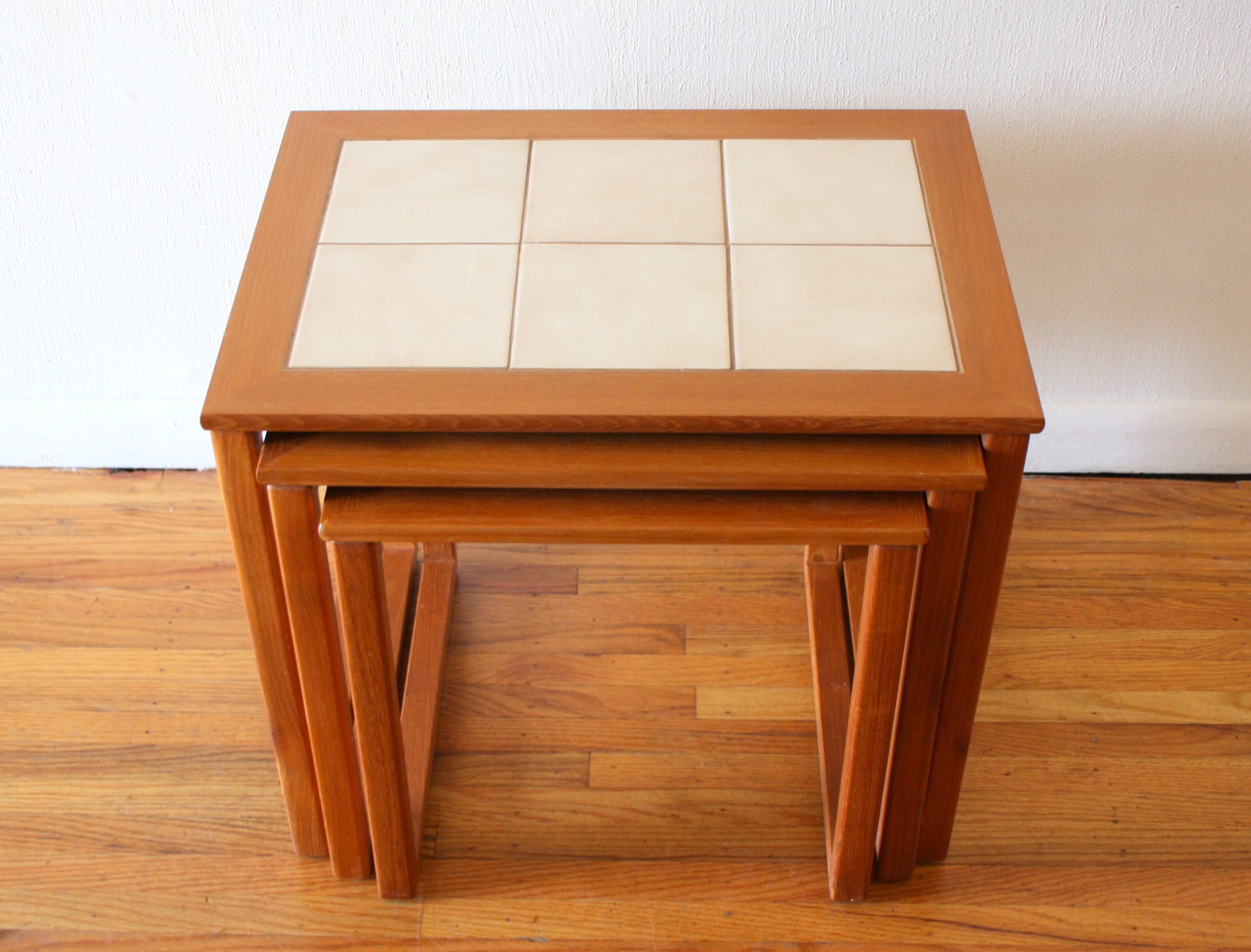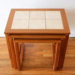 This is a set of 3 Danish teak nesting tables with tile tops. Each table has a teak base and and a tile top in eggshell. Dimensions of largest table: 22″W x 16″D x 18.5″H. Medium: 19″W x 16″D x 17.5″H. Smallest table: 16″W x 16″D x 16″H.