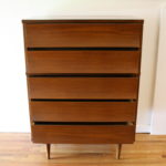 Mid Century Modern Tall Dresser by Johnson Carper This is a mid century modern tall dresser by Johnson Carper. It has 5 dovetailed drawers with their signature concave drawer design, and tapered legs. Dimensions: 32″W x 18″D x 44.5″H. *SOLD*