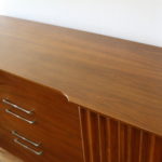 This is a mid century modern credenza with gorgeous sculpted doors, 3 dovetailed drawers with faux brass pulls, a cut out design on top, and tapered legs. The left cabinet has shelf storage, and the right cabinet has a utility drawer. Dimensions: 62″W x 20″D x 30.5″H.