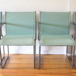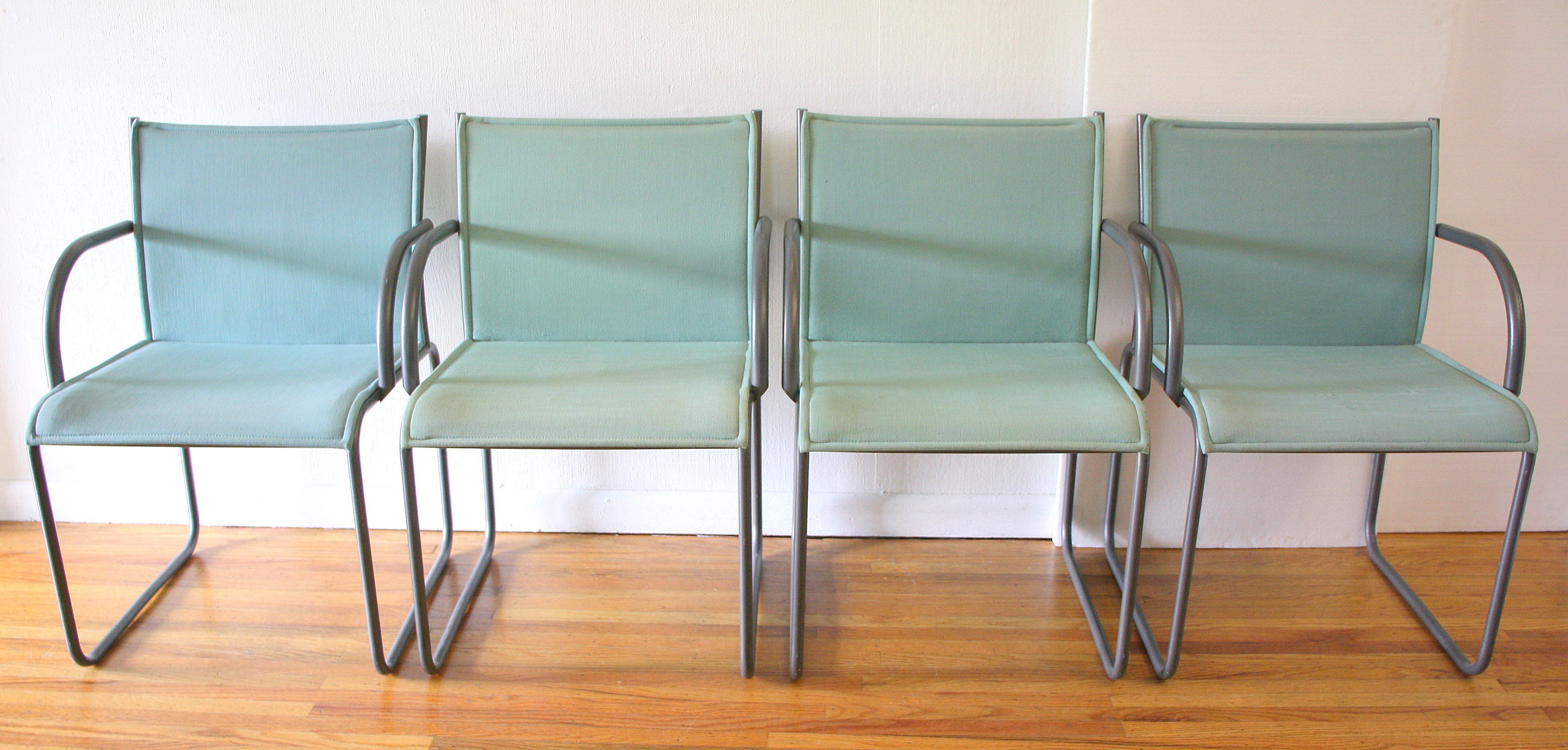 These are 4 mid century modern Knoll arm chairs designed by Richard Schultz. The have metal bases and upholstered turquoise canvas backs and seats. One of the chairs is a little lighter turquoise blue than the other three.