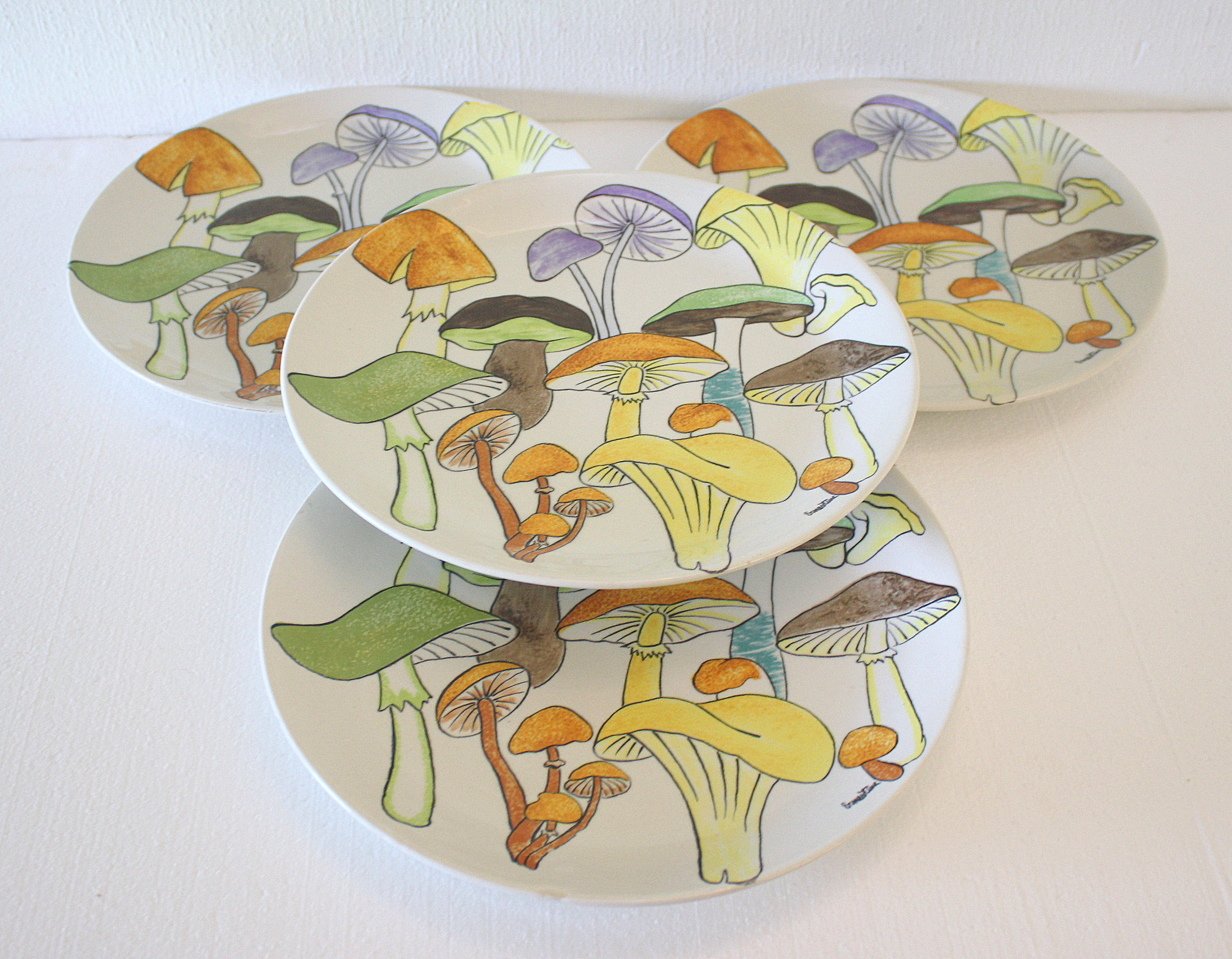 This is a set of 4 mid century modern dinner plates signed and hand painted by Ernestine Cannon. She...