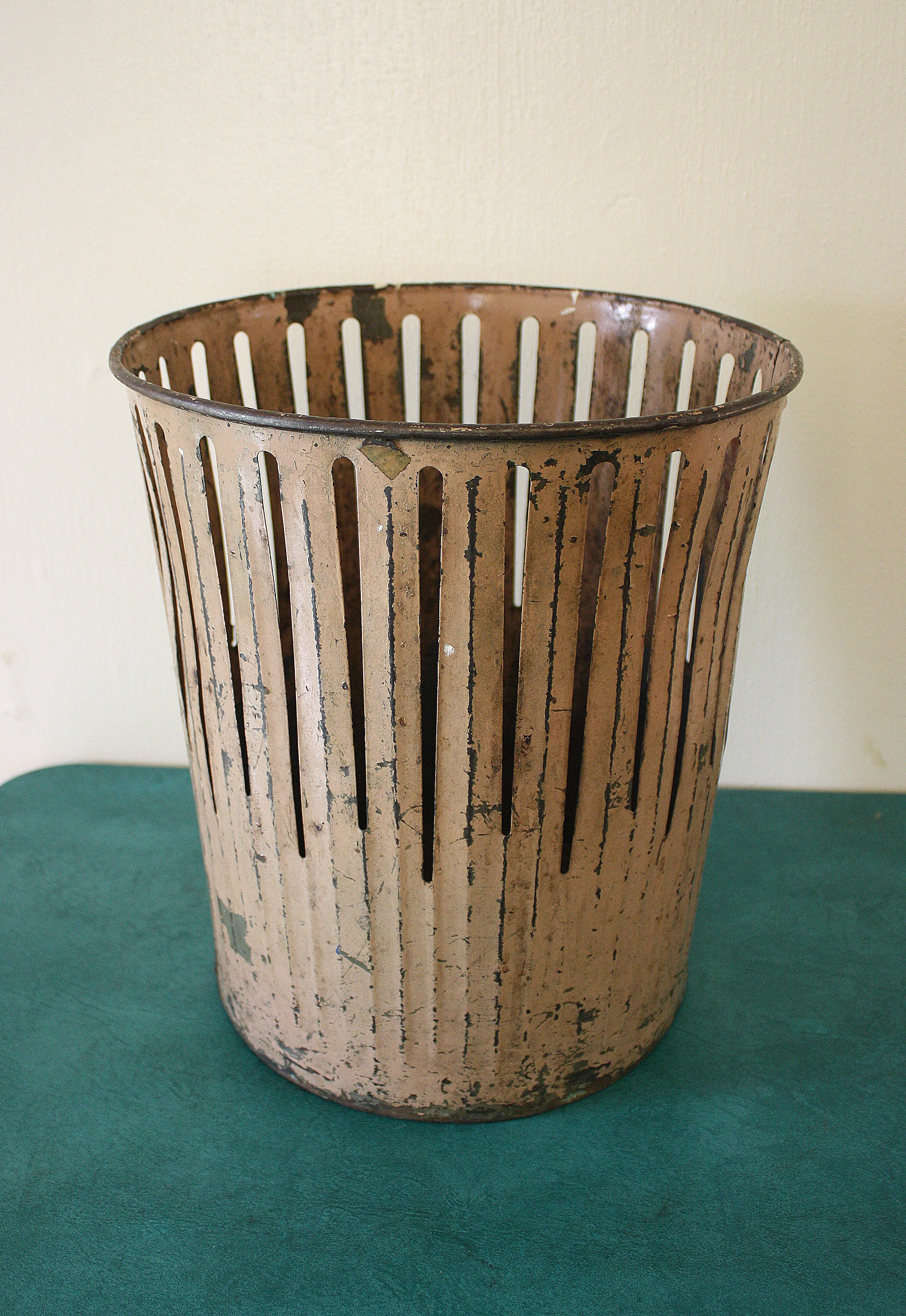 These are vintage industrial trash cans made of solid metal. Each can has its own different color, aged patina,...
