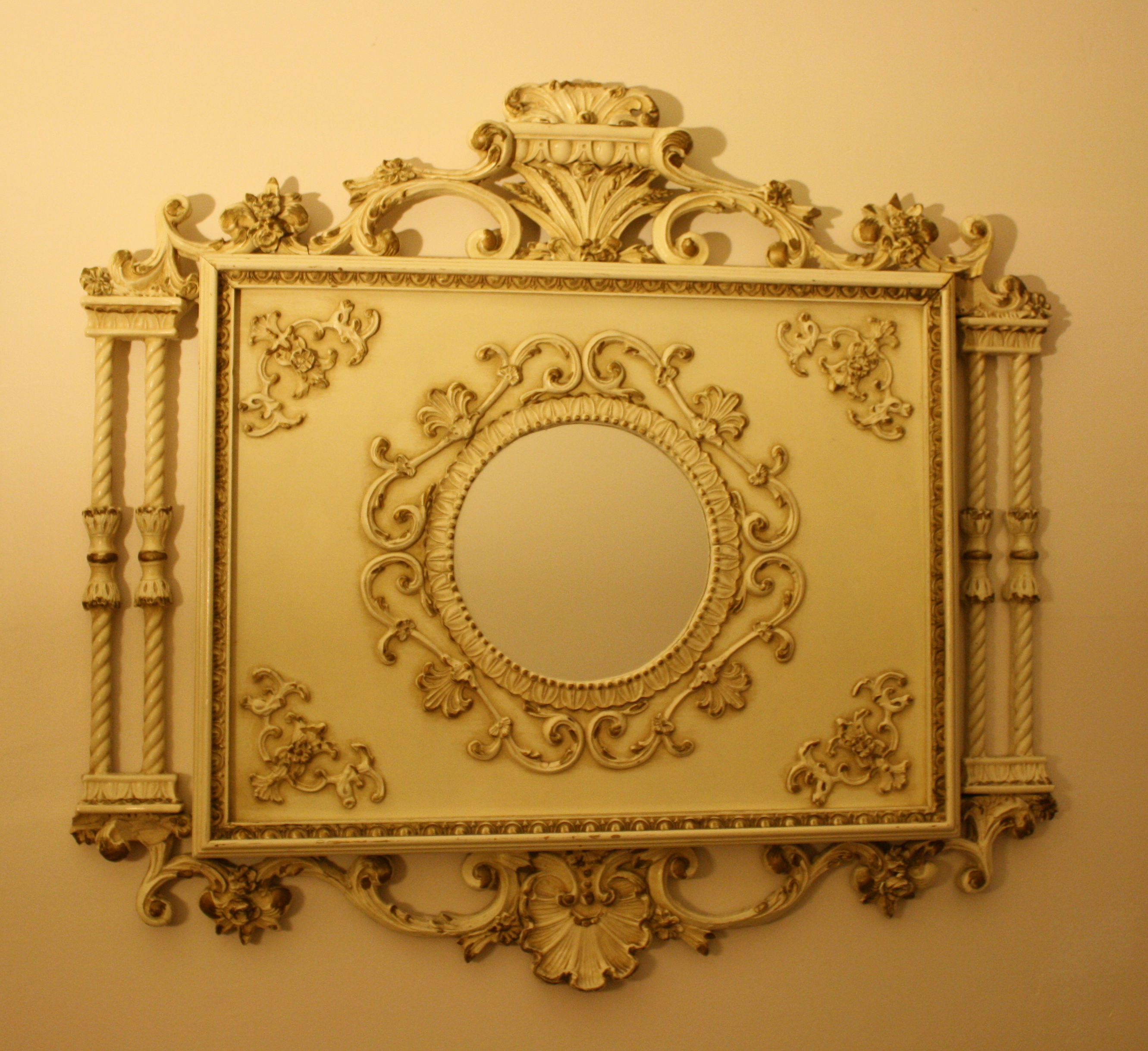 This is a French Provincial mirror with a beautiful ornate scrolling wood frame. The mirror is perfectly intact. Dimensions:...