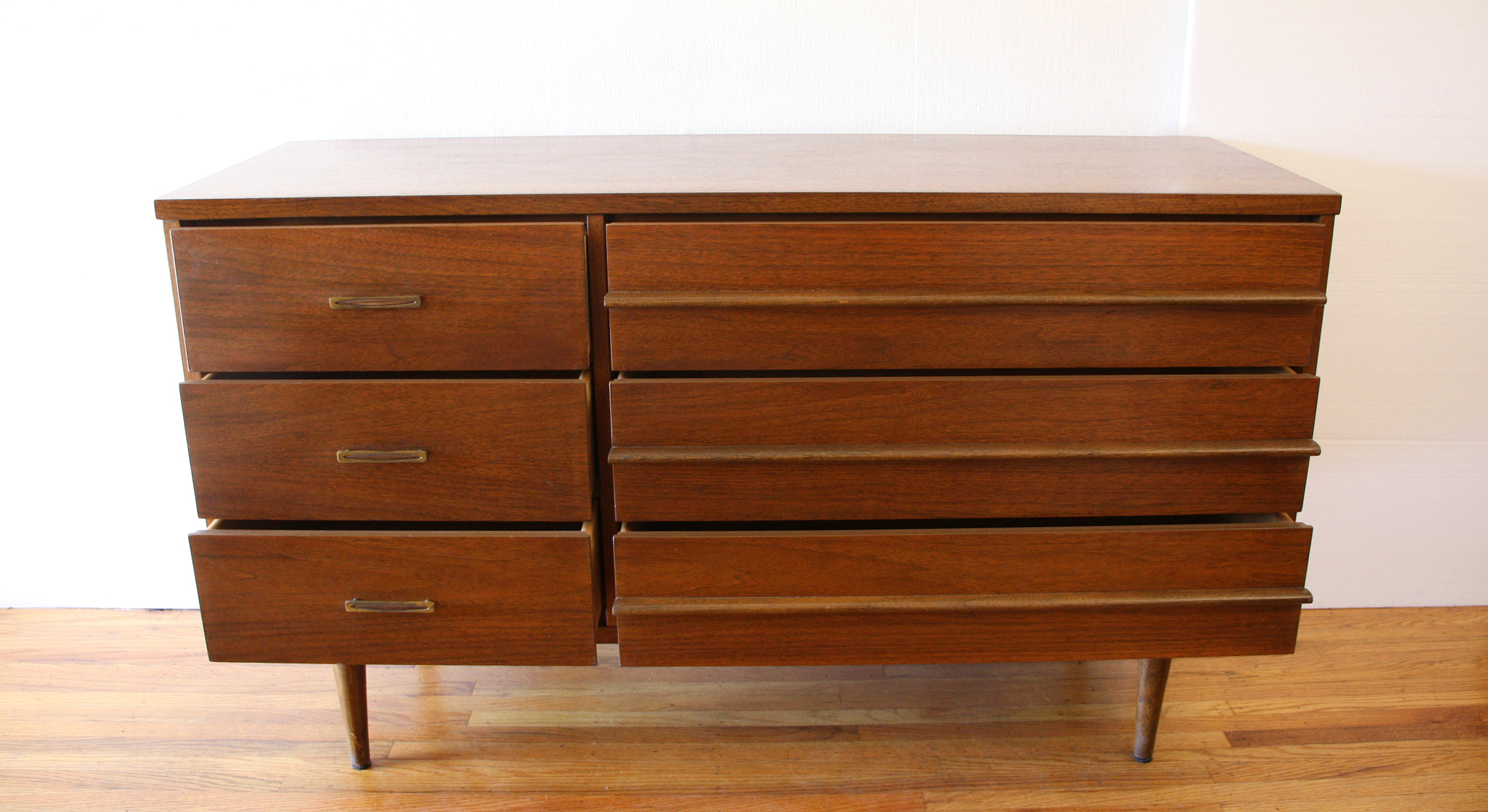 This is a mid century modern low dresser credenza by Bassett. It has 6 dovetailed drawers with a streamlined...