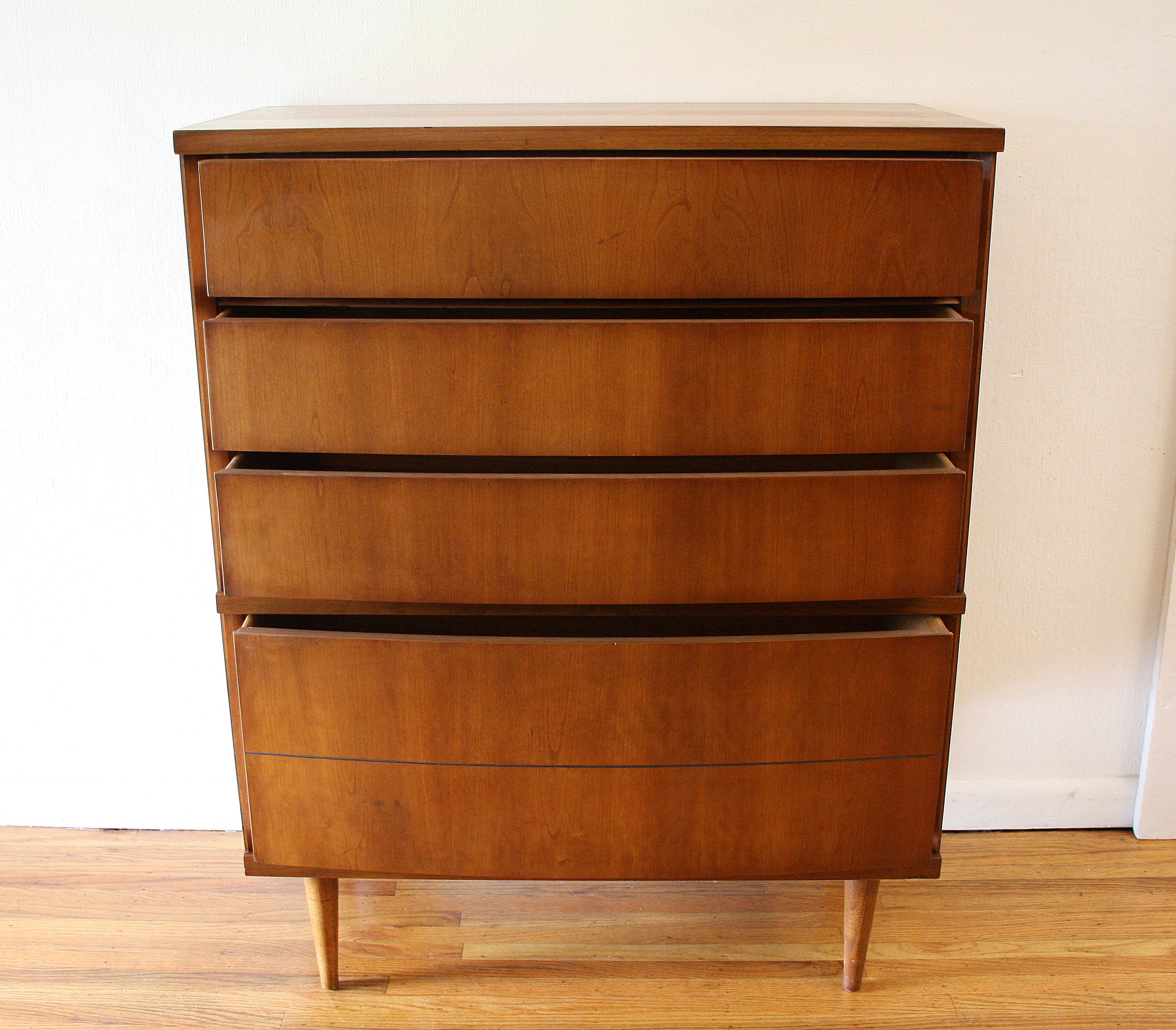 This is a mid century modern tall dresser by Johnson Carper. It has 5 dovetailed drawers with their signature...