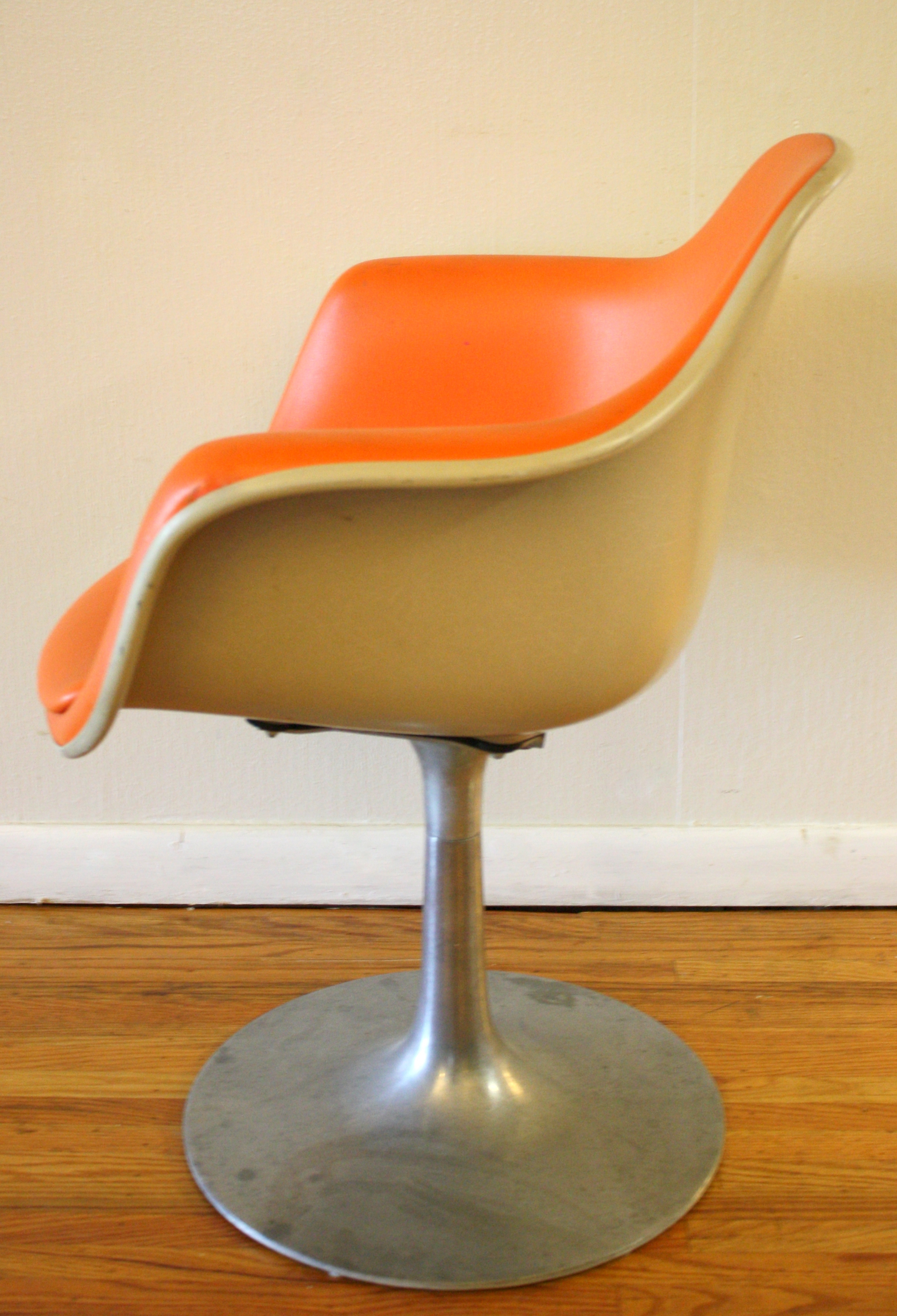This is a mid century modern Eames, Herman Miller style shell chair by Krueger. It is upholstered in orange...