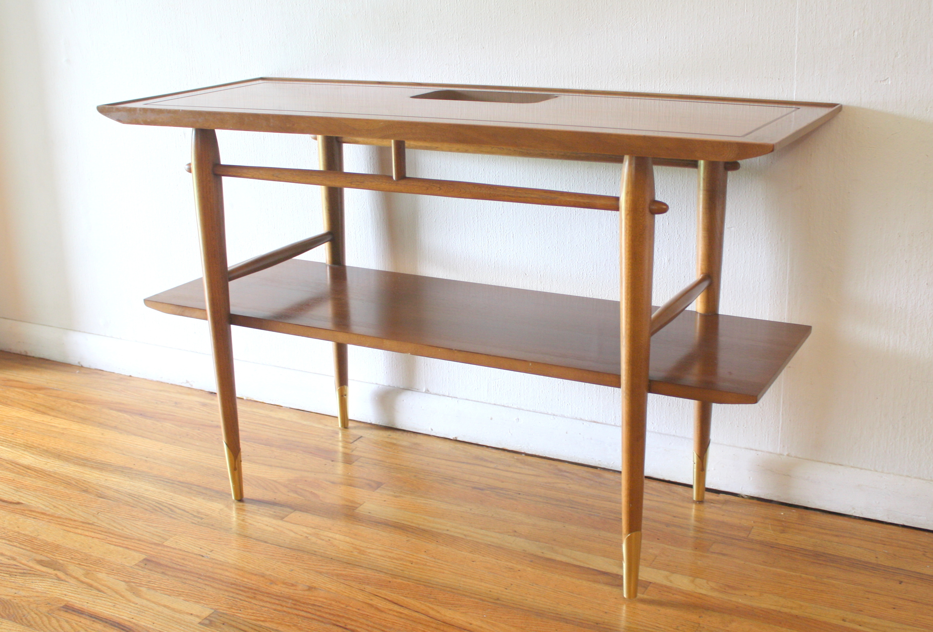 This is a mid century modern console sofa table from Lane’s Copenhagen series. It has their signature brass tipped...