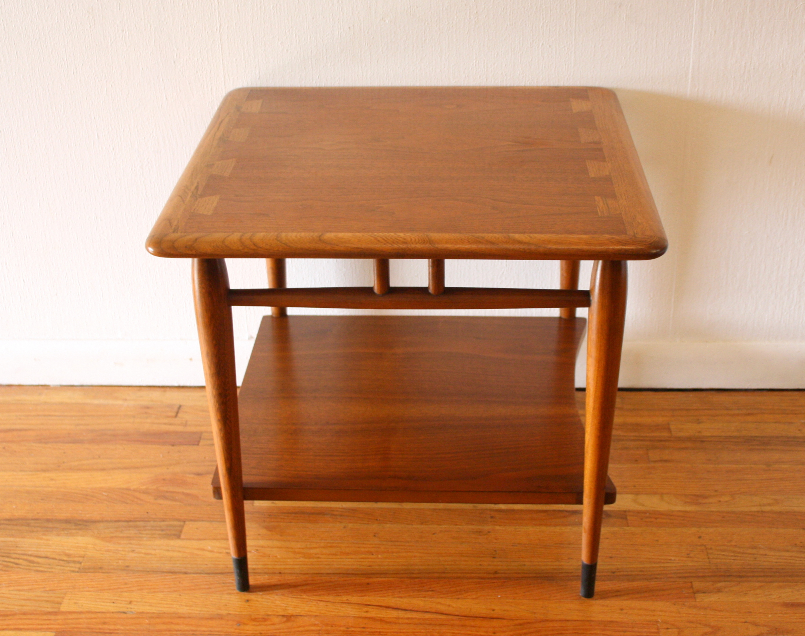 These are 2 mid century modern side end tables by Lane. The first has a sculpted base, parquet design...
