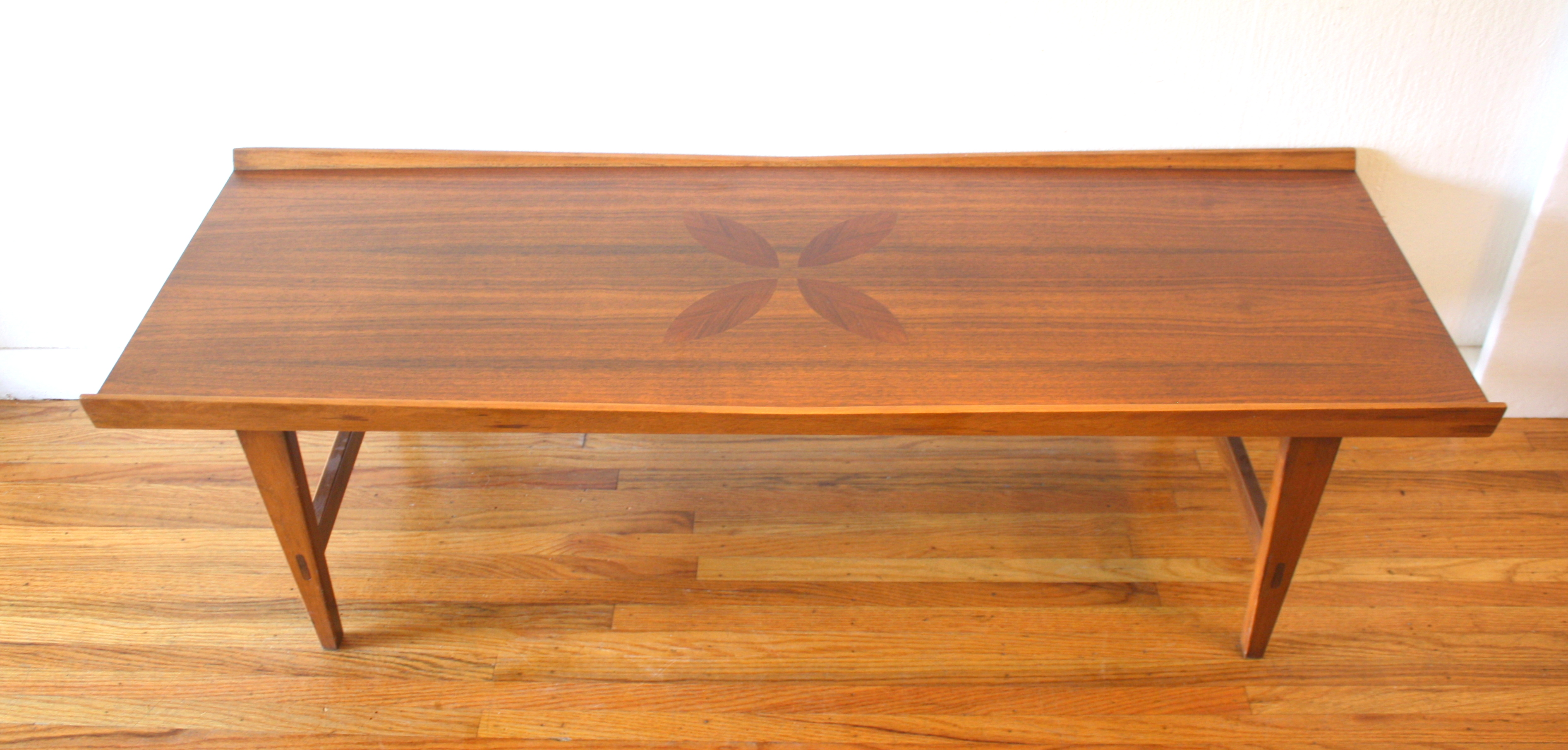 This is a mid century modern coffee table with an inlaid wood parquet design, angled bowtie sides, and tapered...