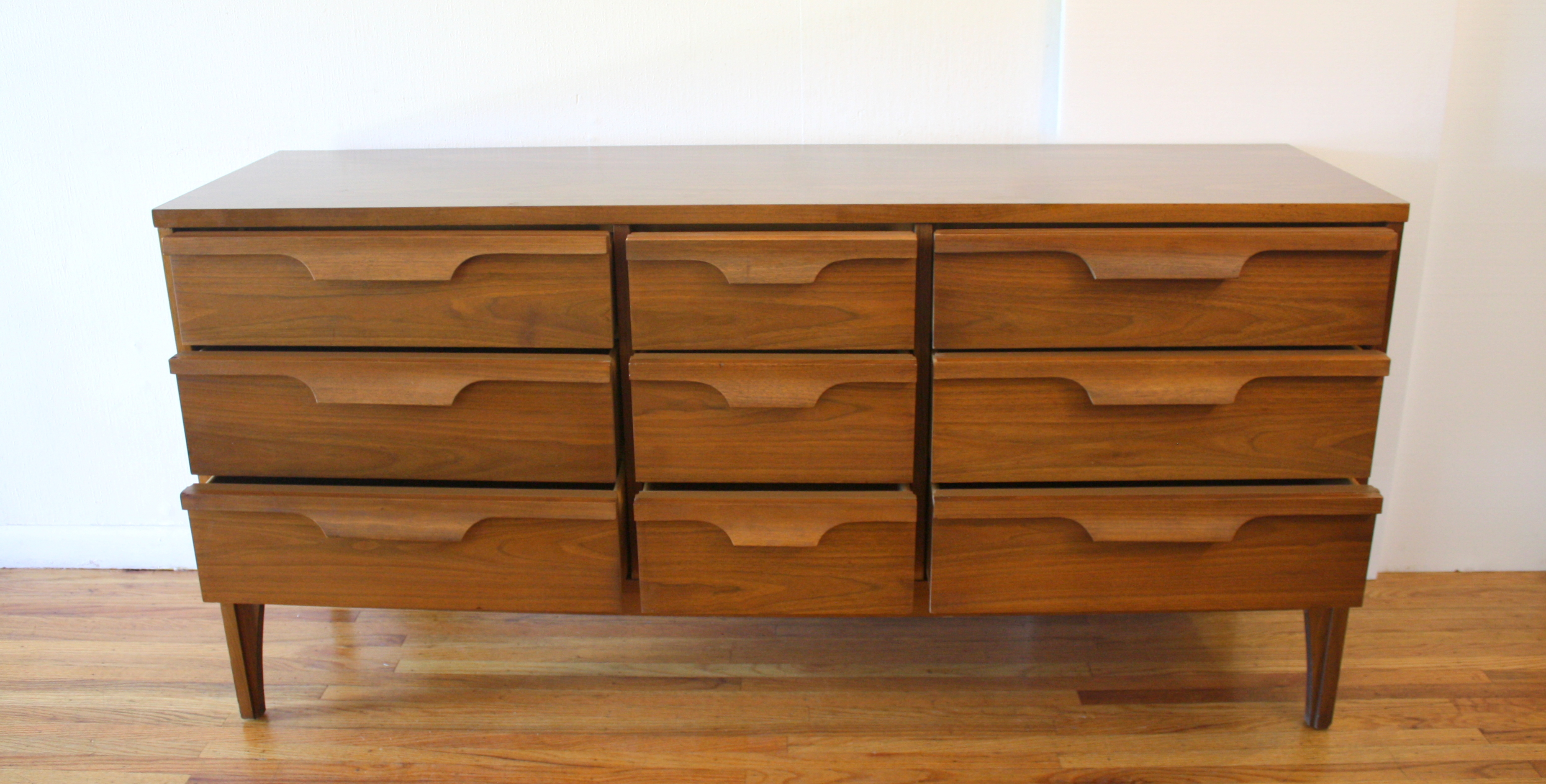 These are 2 mid century modern credenza low dresser credenzas by Johnson Carper. The first has 6 dovetailed drawers with...