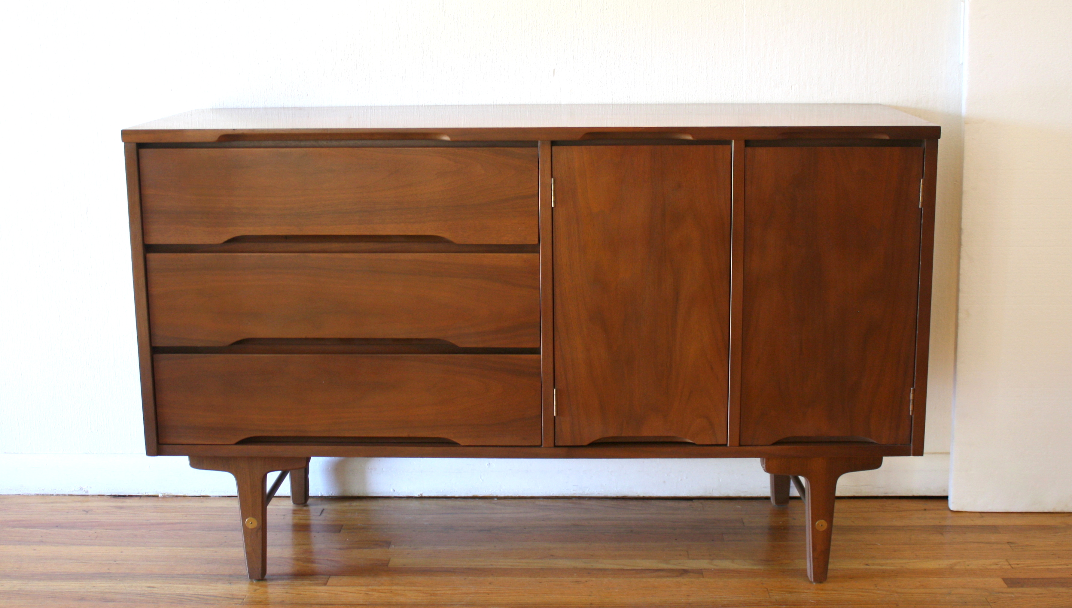 This is a mid century modern credenza by Stanley. It has beautiful brass details in its front tapered legs,...