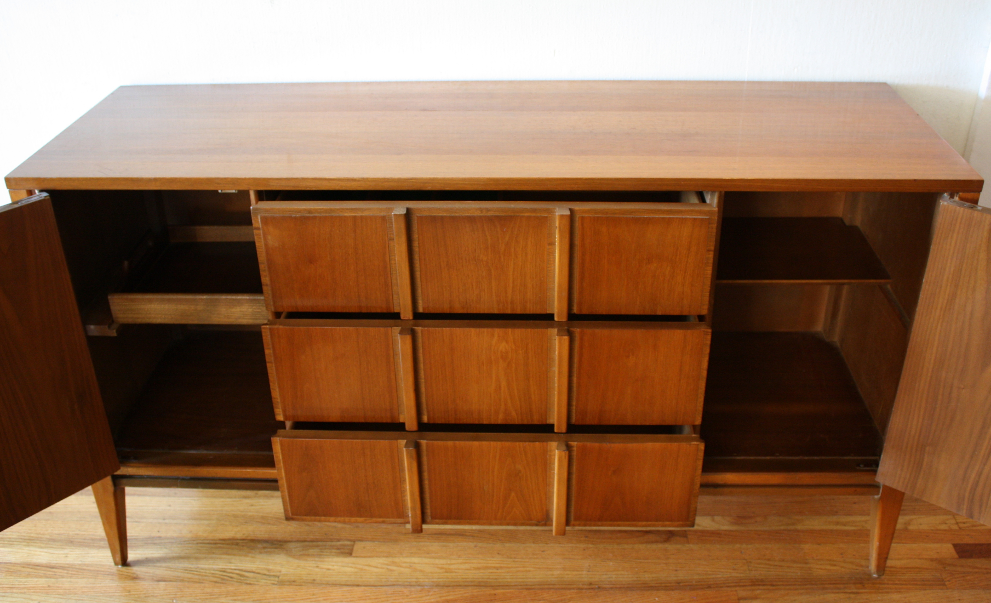 These are 2 mid century modern low dresser credenzas by Basic-Witz. The first low dresser has 6 dovetailed drawers...