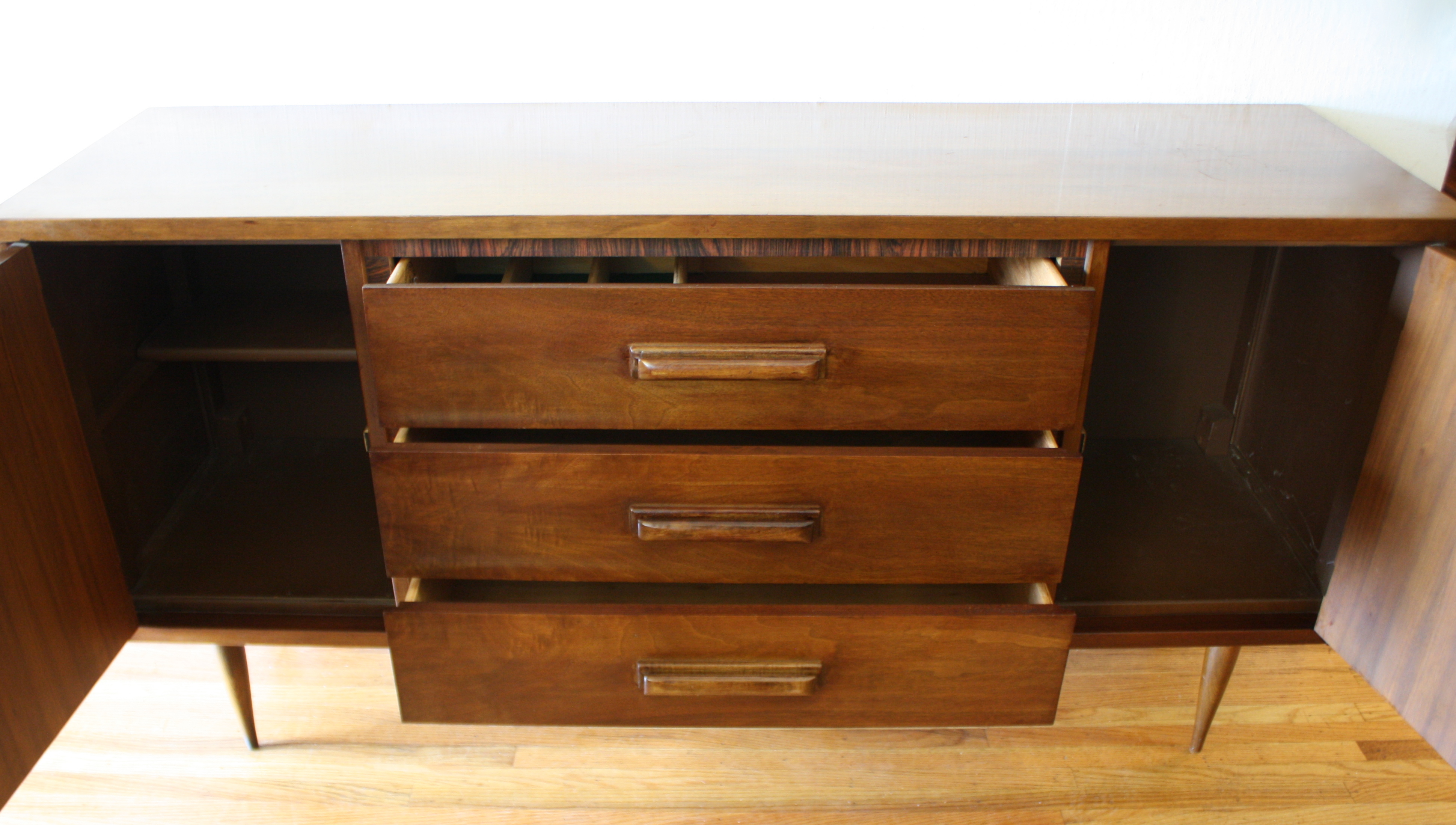 These are 3 mid century modern credenzas. The first credenza is by Bassett, has 3 dovetailed drawers with wood handles, and...