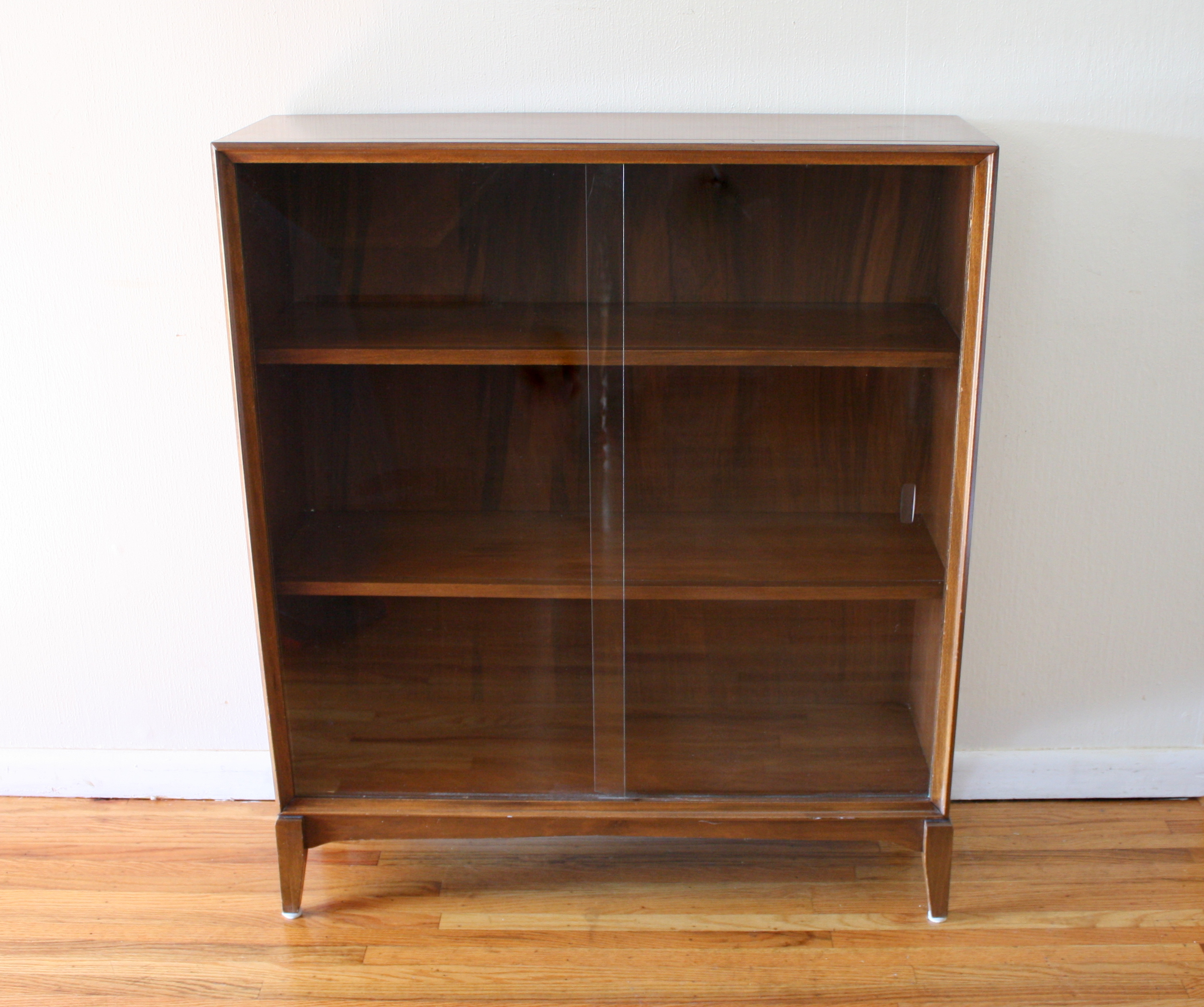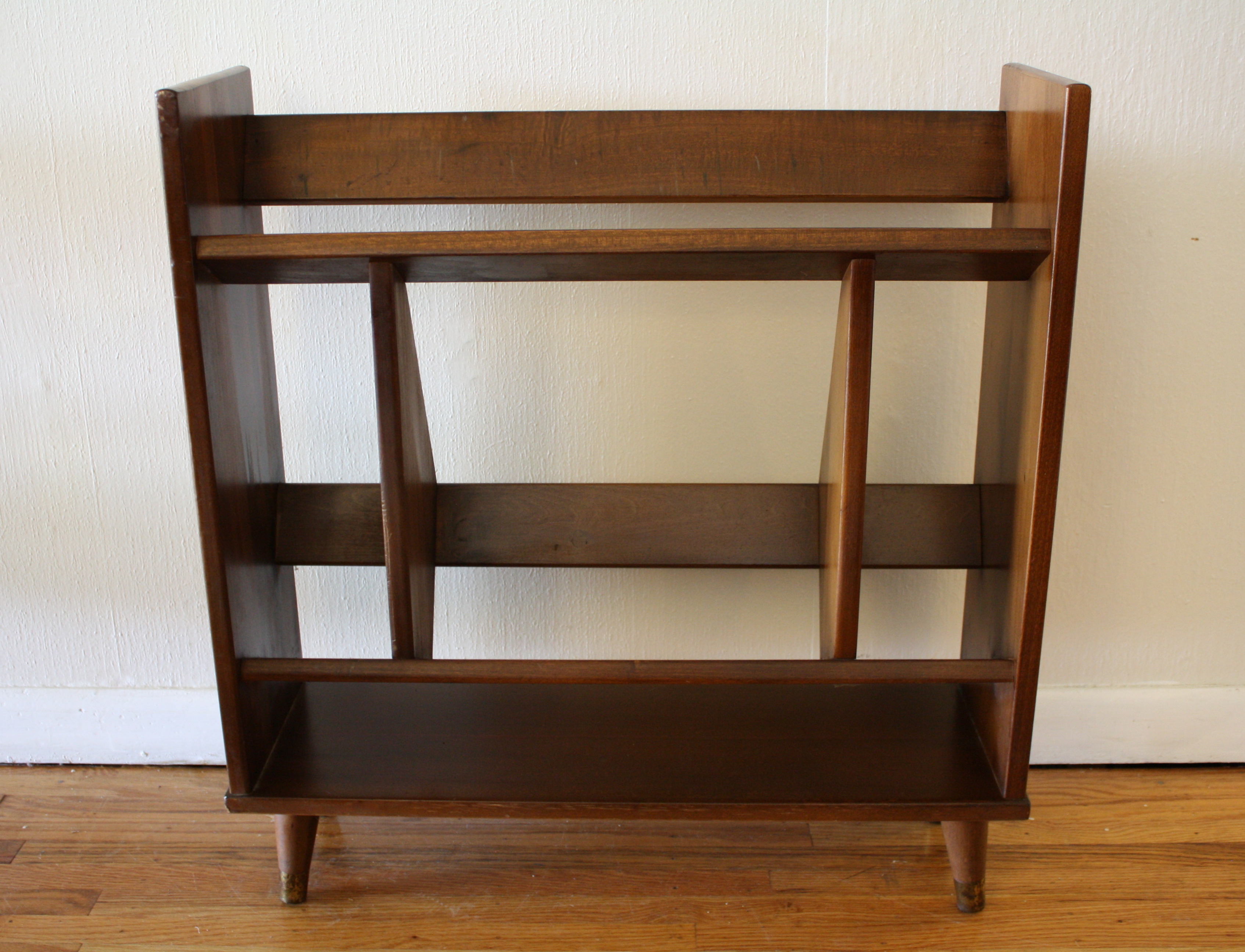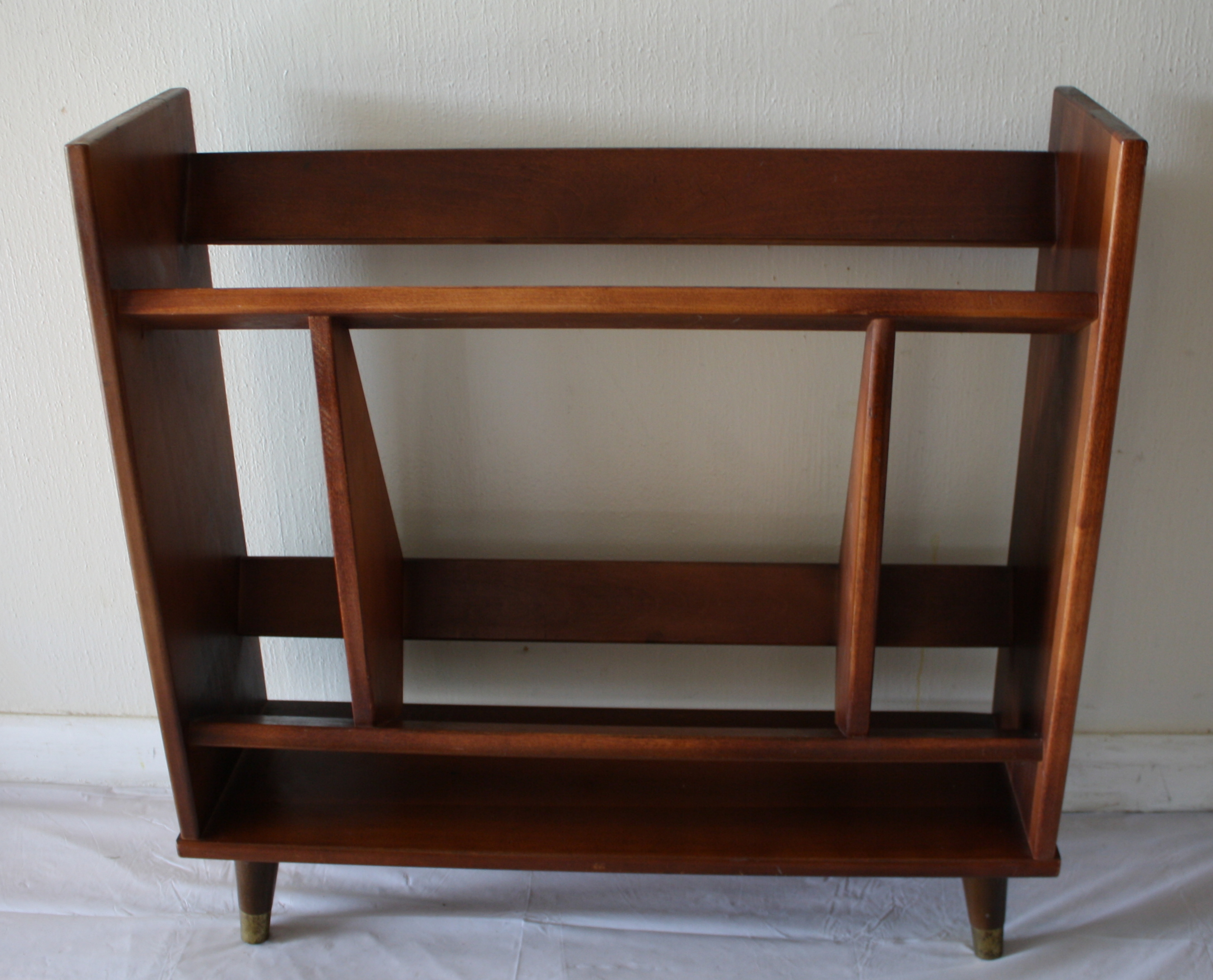 This is a mid century modern Danish style bookcase made of solid wood. It has brass tipped tapered legs...