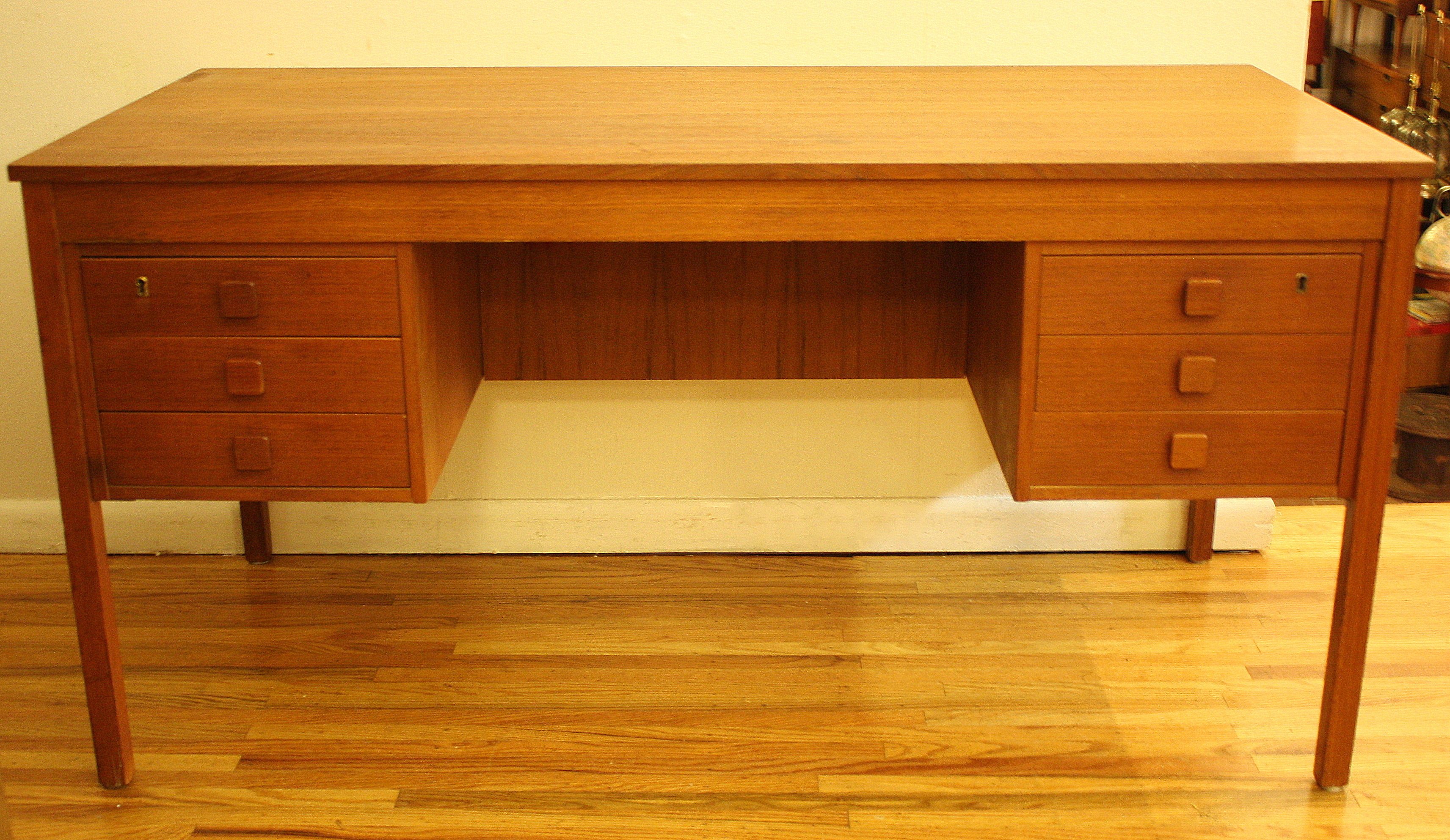 This is a Danish teak executive desk by Domino Mobler. It has 6 dovetailed drawers and a built in...