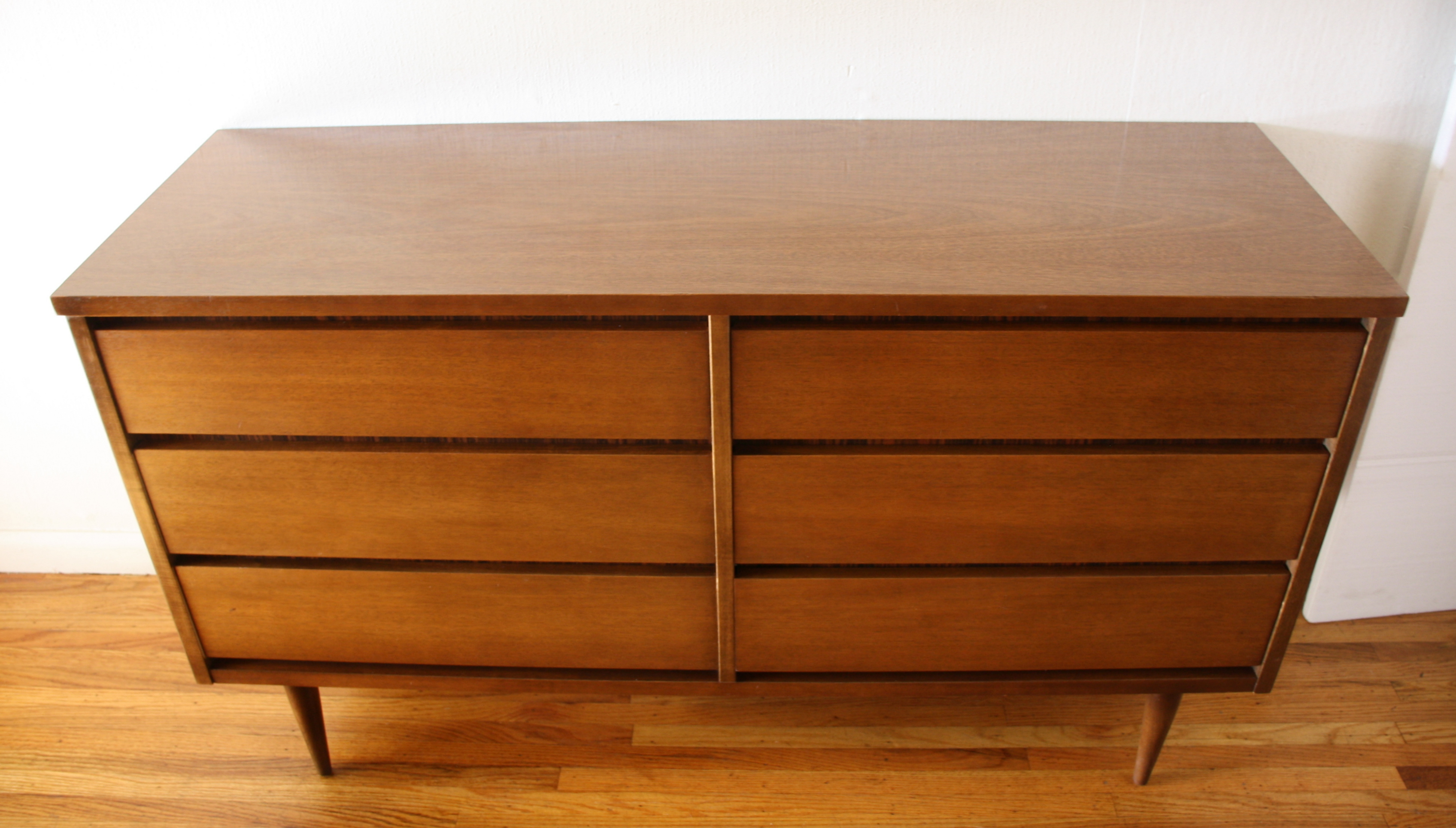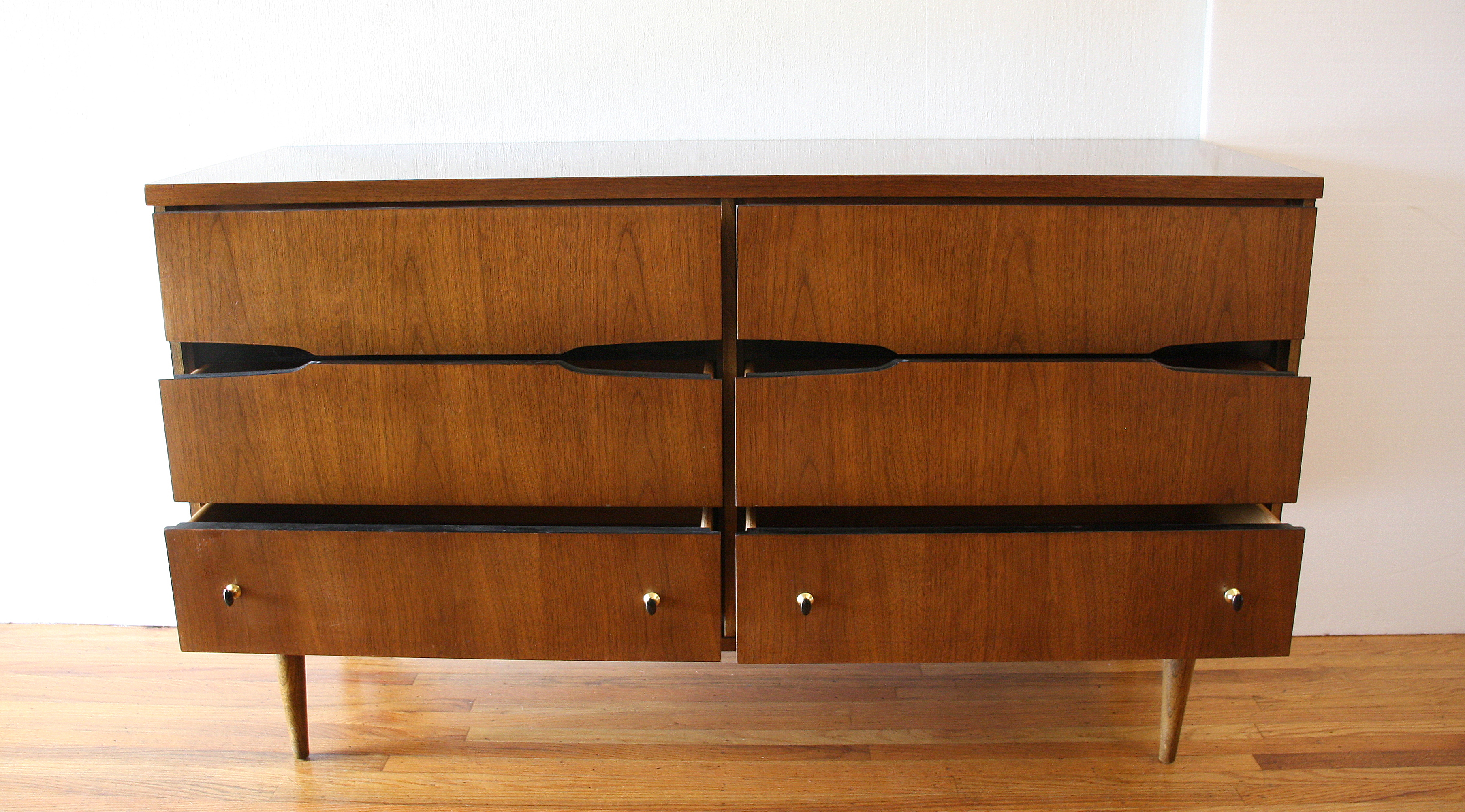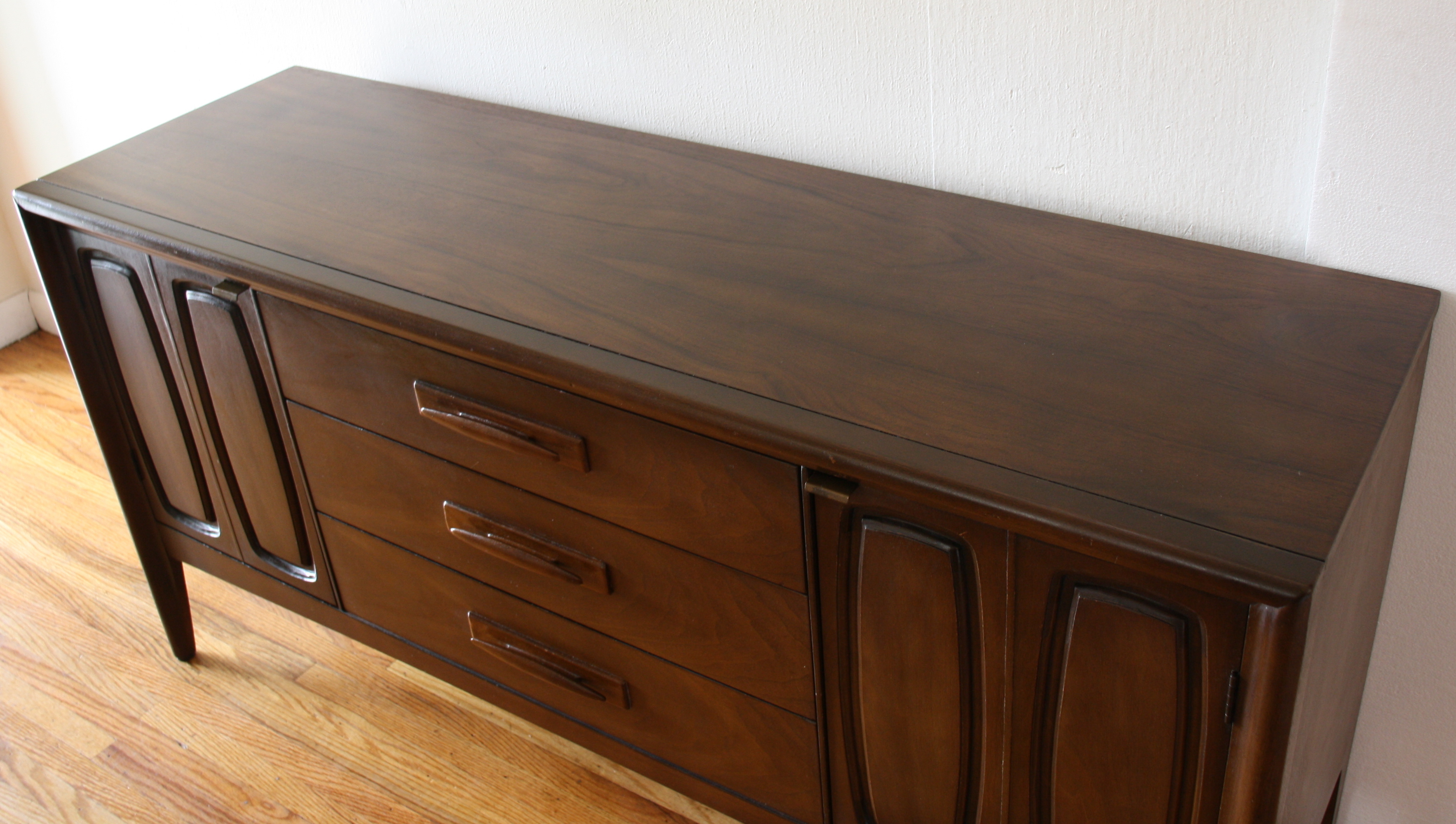 This is a mid century modern low dresser credenza by Bassett. It has 6 dovetailed drawers with sculpted wood...