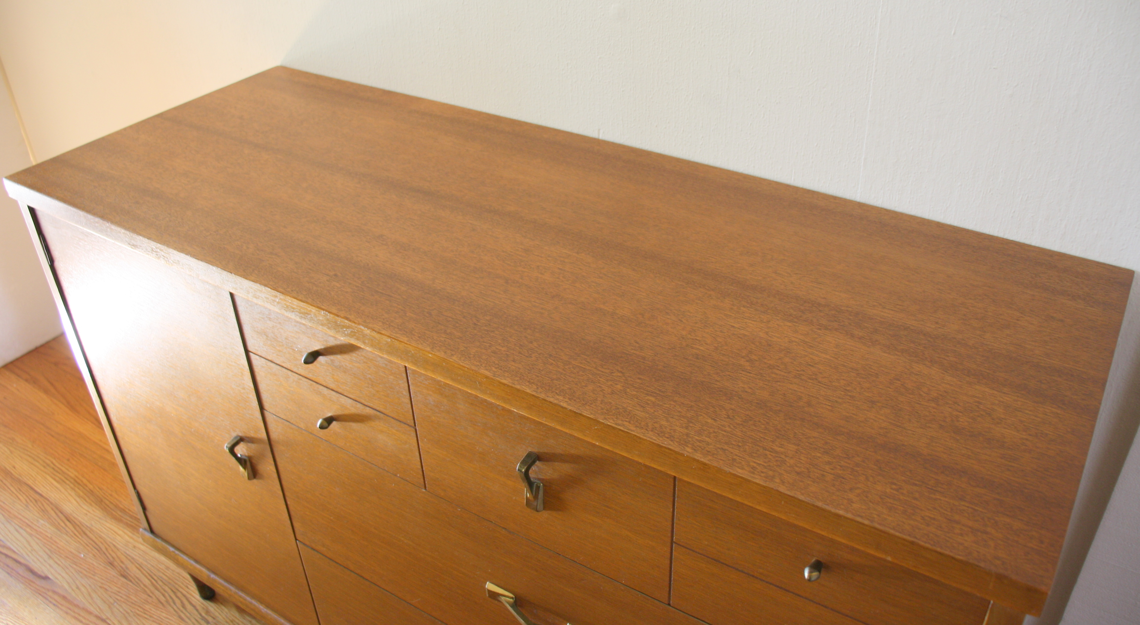 This is a mid century modern mini credenza that has three dovetailed drawers with angled brass pulls and knobs,...