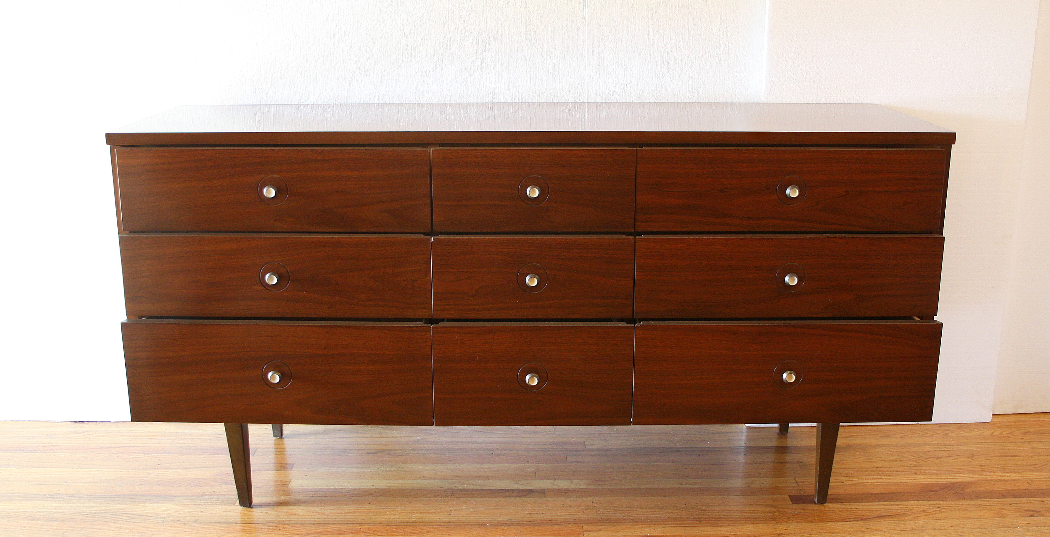 This is a mid century modern low dresser credenza that has nine dovetailed drawers with a beautiful wood grain,...