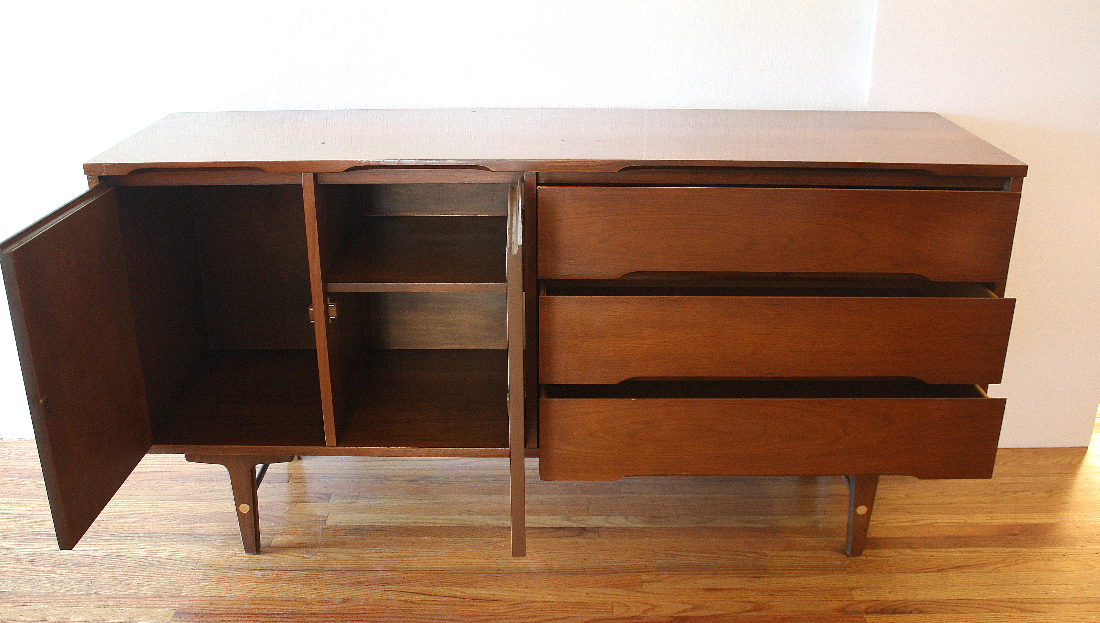 This is a mid century modern credenza by Stanley. It has an asymmetrical design, brass accented tapered legs, 3...