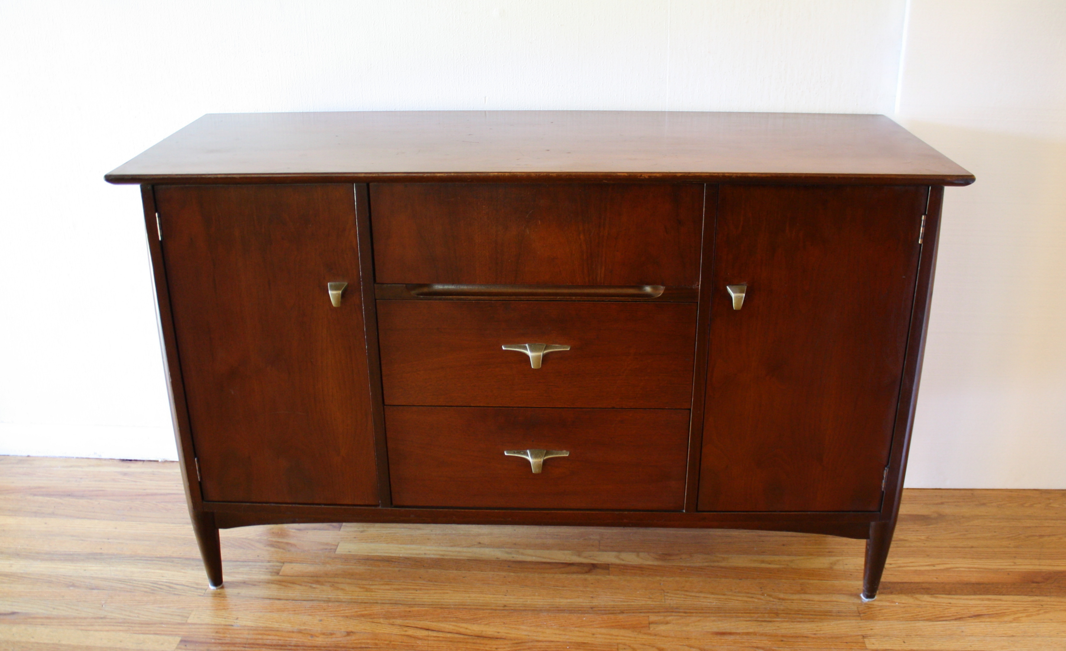 This is a mid century modern credenza by Harmony House. It has 3 dovetailed drawers with aviator style brass handles,...
