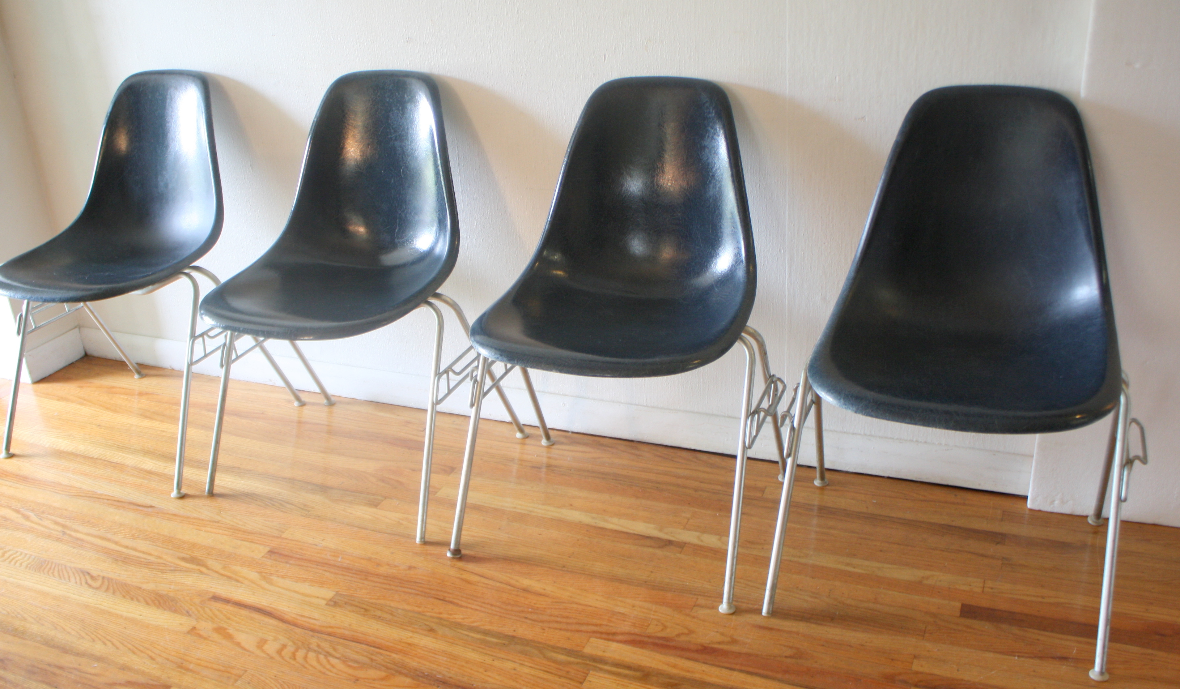 This is a set of 4 mid century modern chairs in midnight blue by Herman Miller. They have fiberglass...