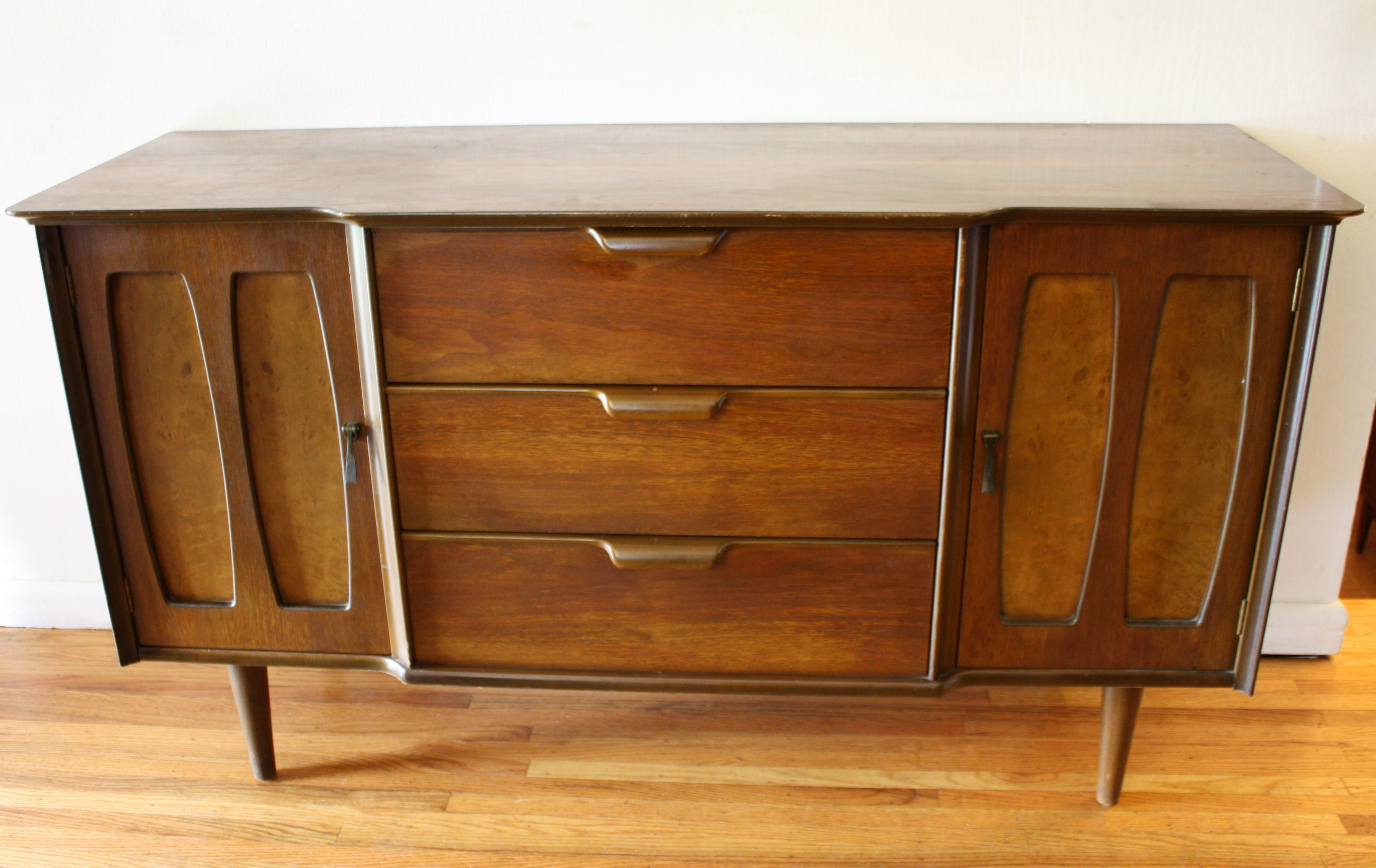 These are 2 mid century modern credenzas. The first credenza is by Stanley, has 2 side cabinets with sculpted...