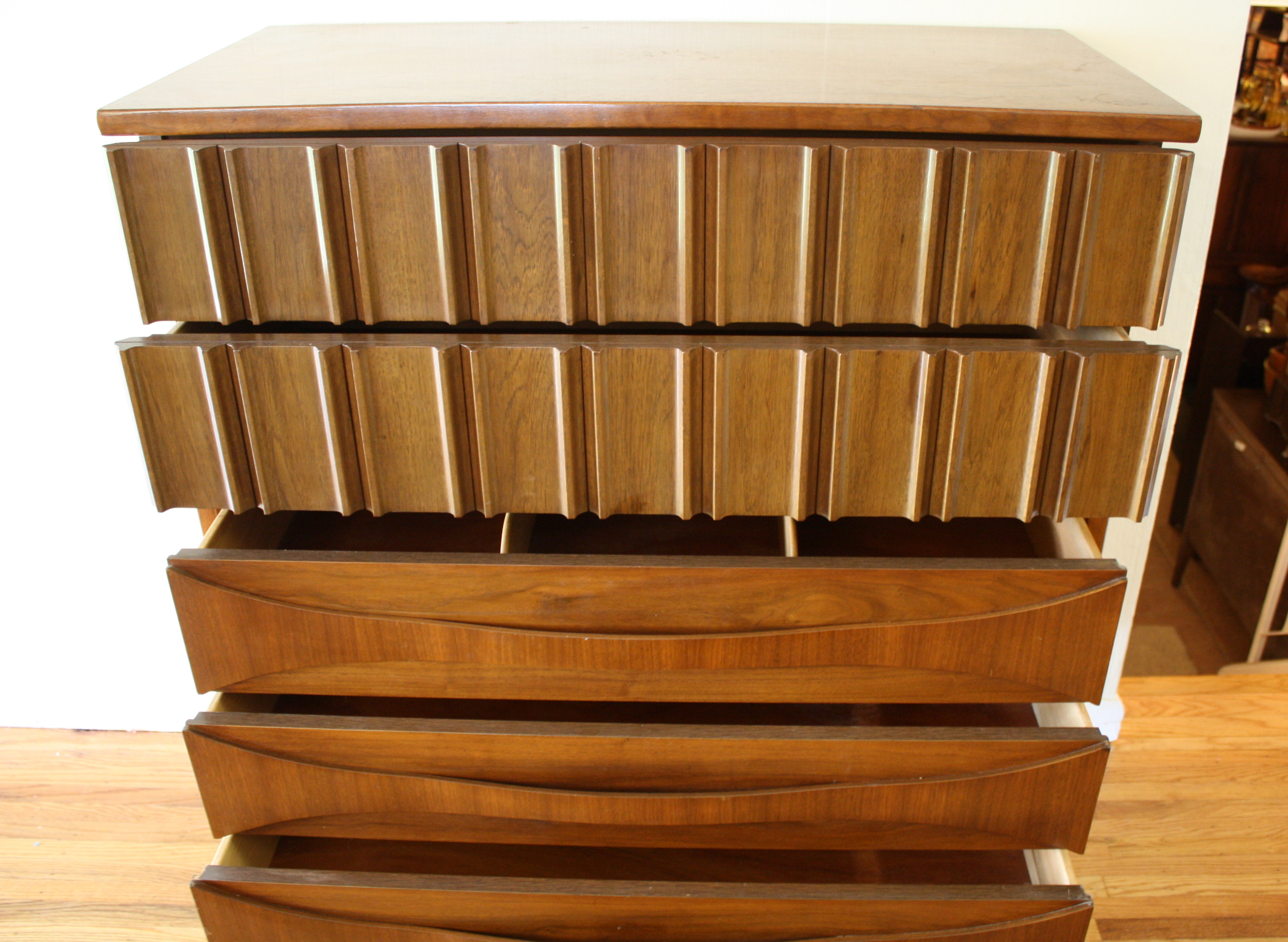 This is a mid century modern dresser with 5 sculpted dovetailed drawers. Dimensions: 39″W x 19″D x 45″H *SOLD*