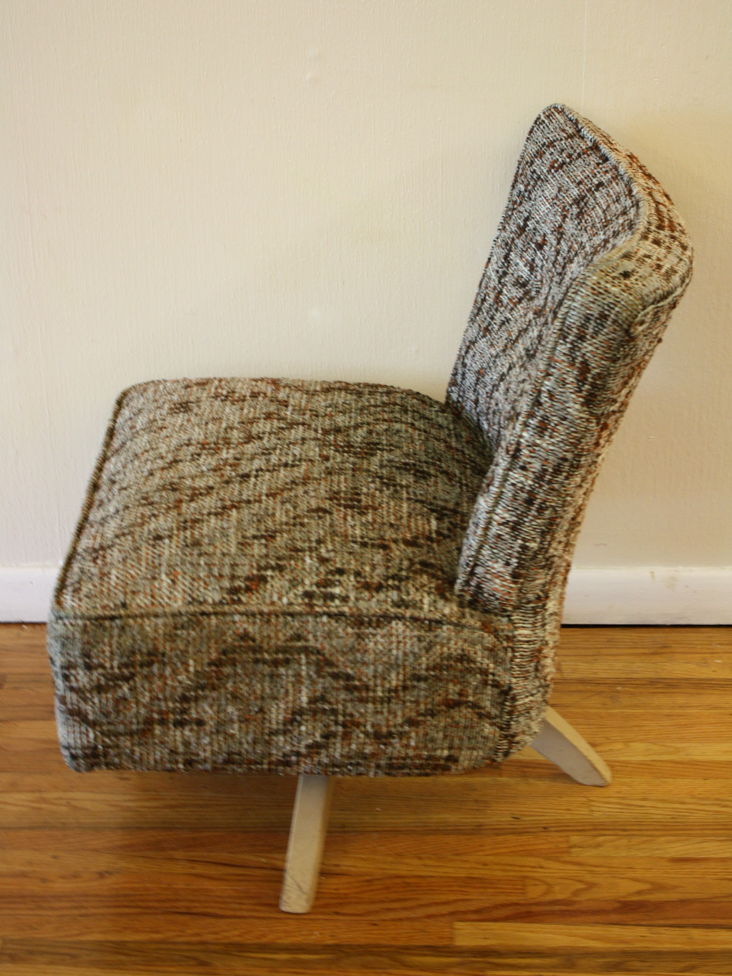 This is a mid century modern upholstered chair. It has a cool grey patterned upholstery, swivels, and is a...