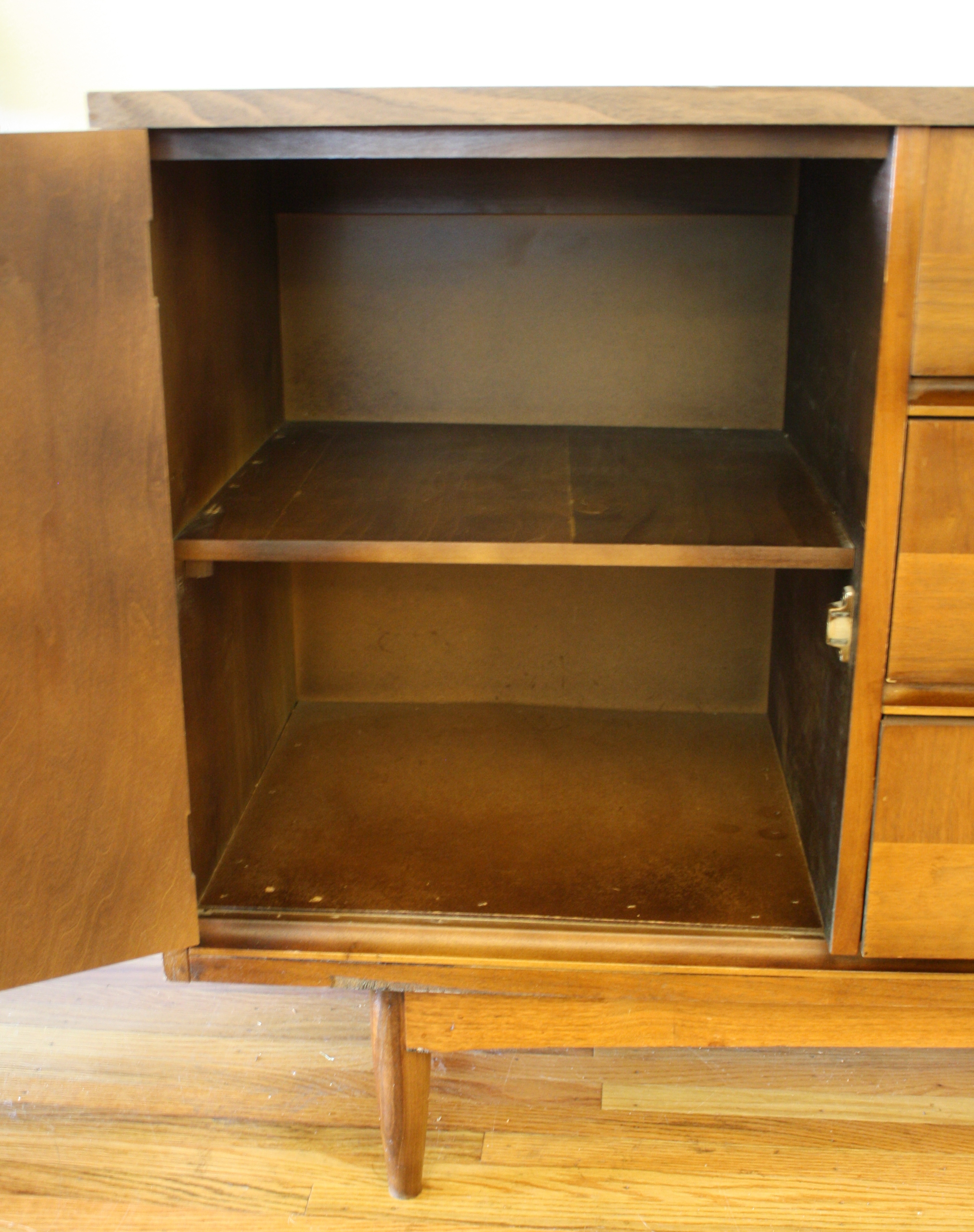 This is a mid century modern small credenza that has a great contrasting wood design on the front. It...