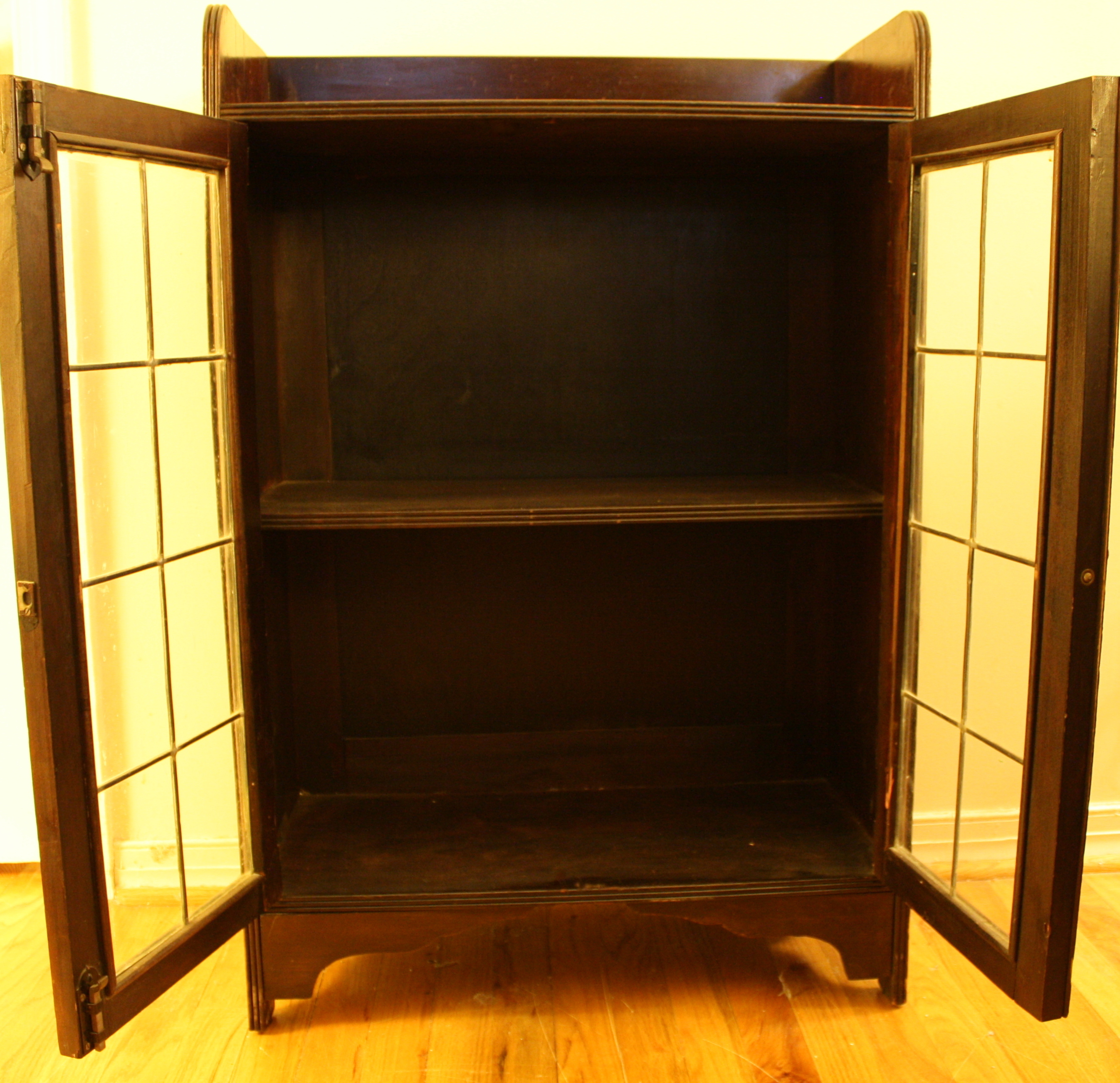 This is an antique leaded glass cabinet made of solid wood. It has a top shelf and two original...