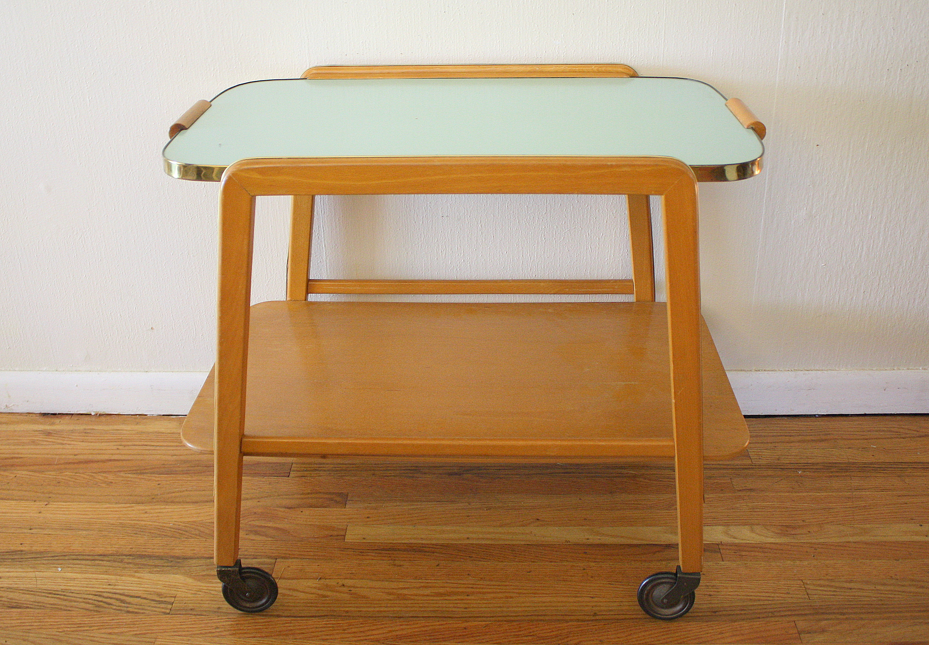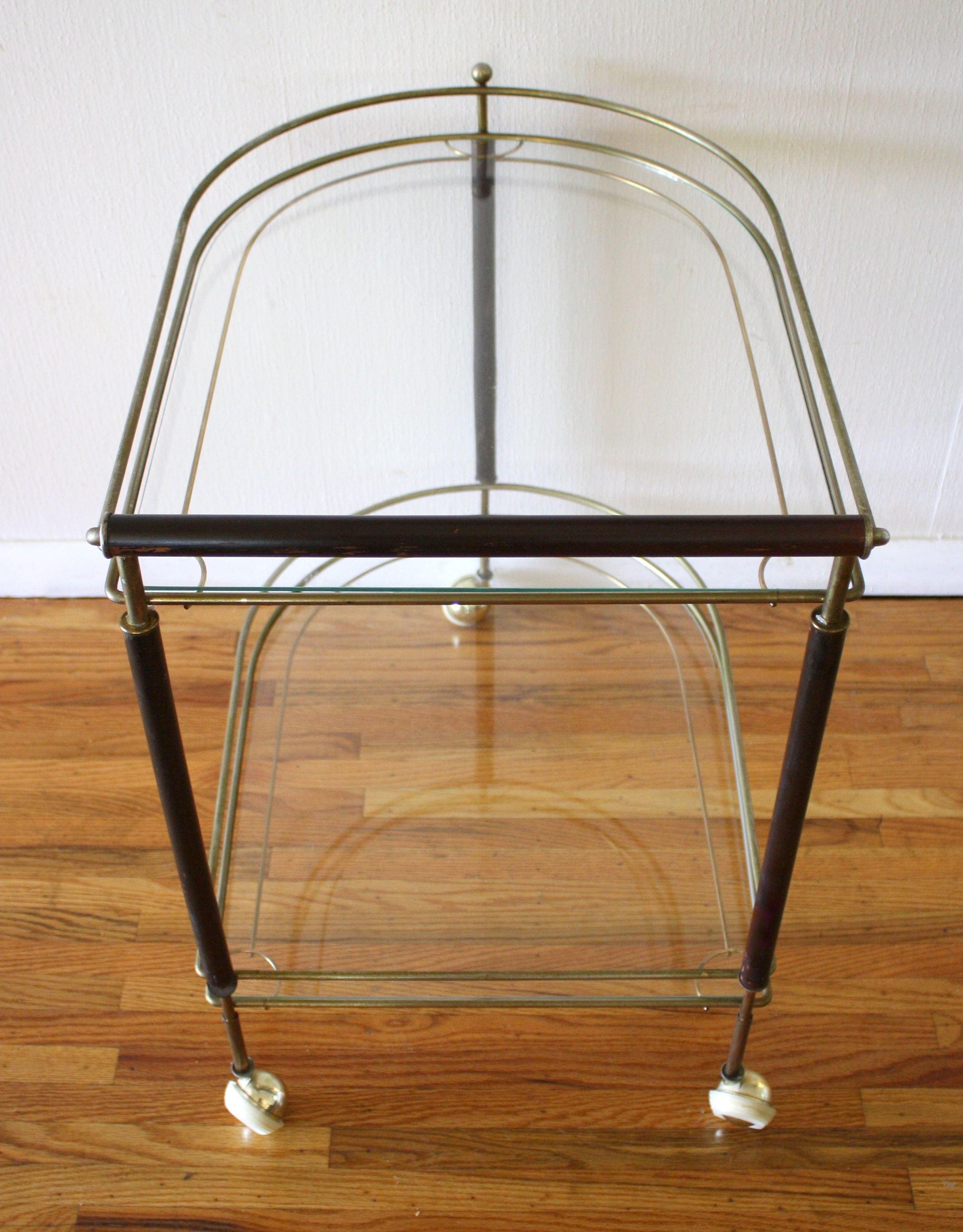 This is a mid century modern rolling glass cart on casters. It has two tiers of glass, a brass...