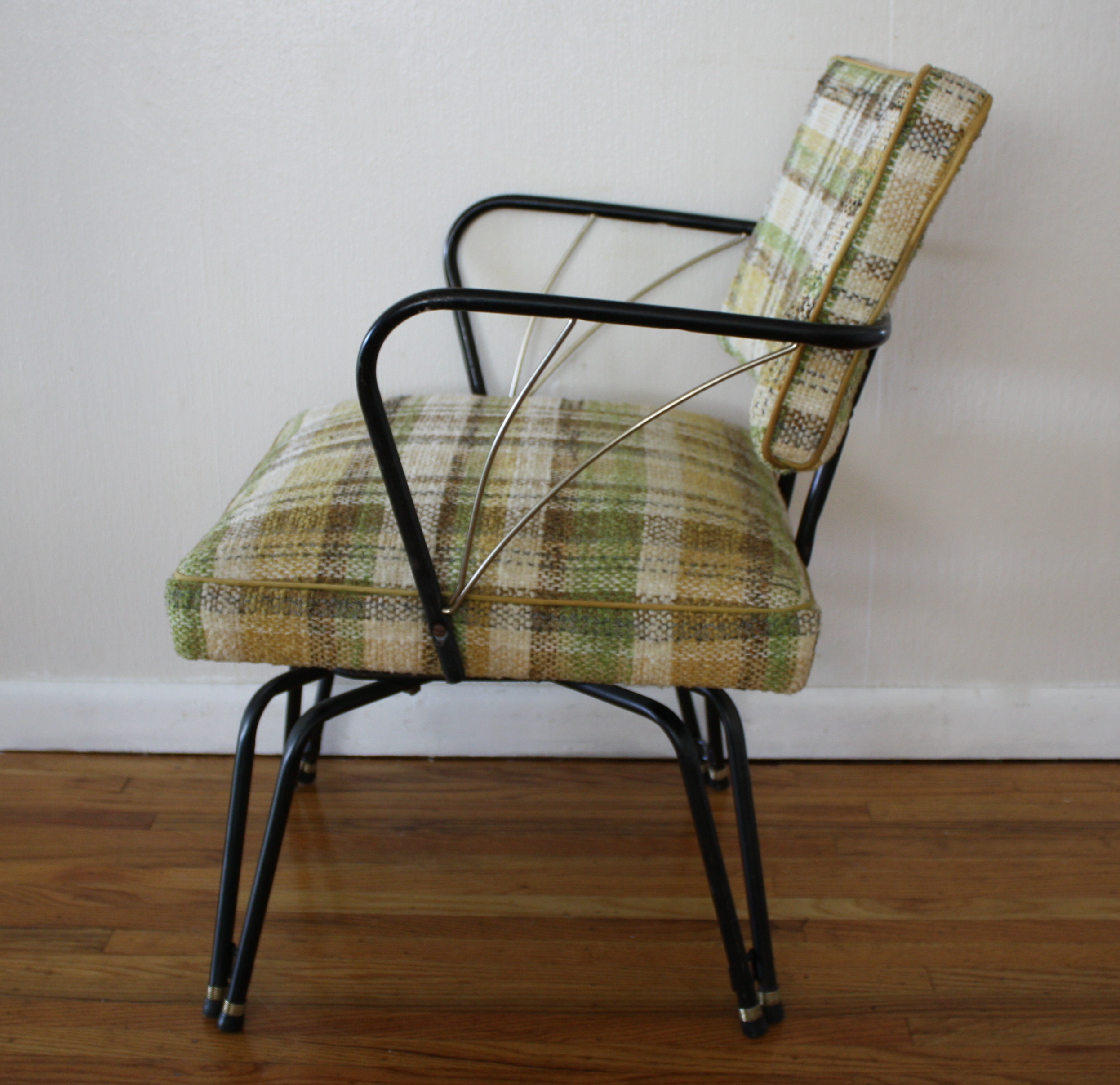 This is a mid century modern upholstered chair. It has a cool green plaid upholstery, swivels, and is a...