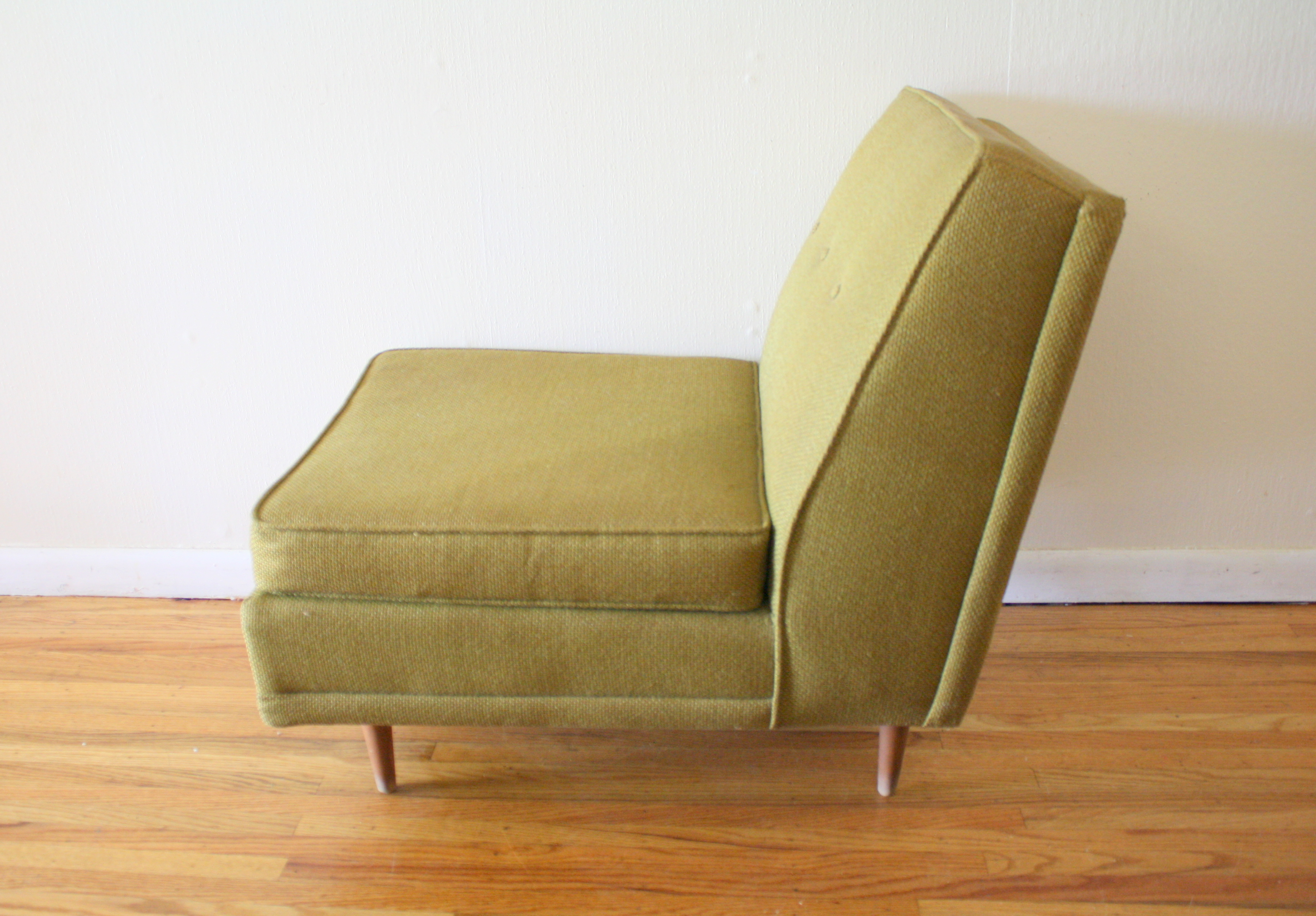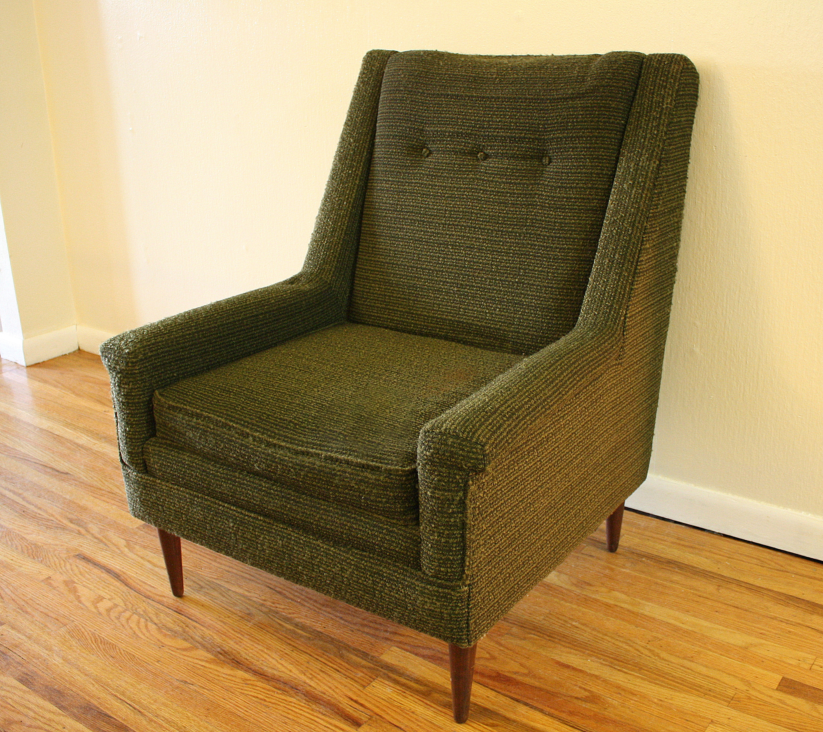 This is a mid century modern upholstered lounge chair. Cool simple streamlined style, a very comfortable seat, and tapered...